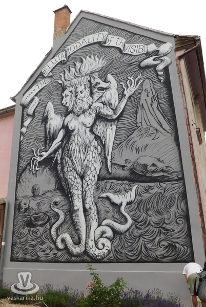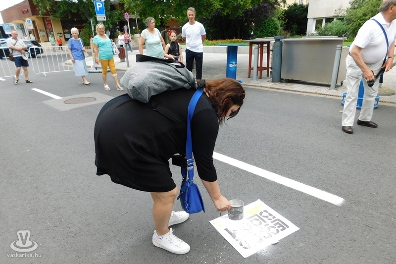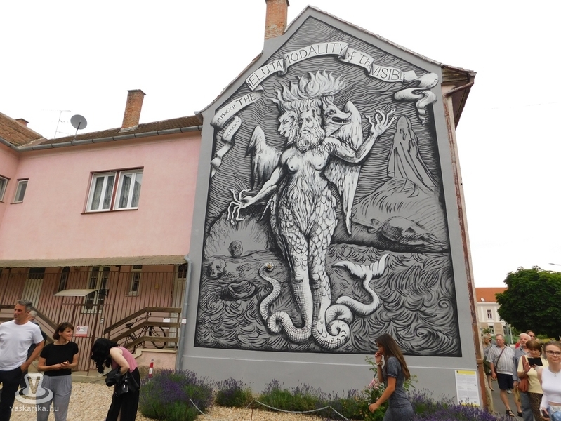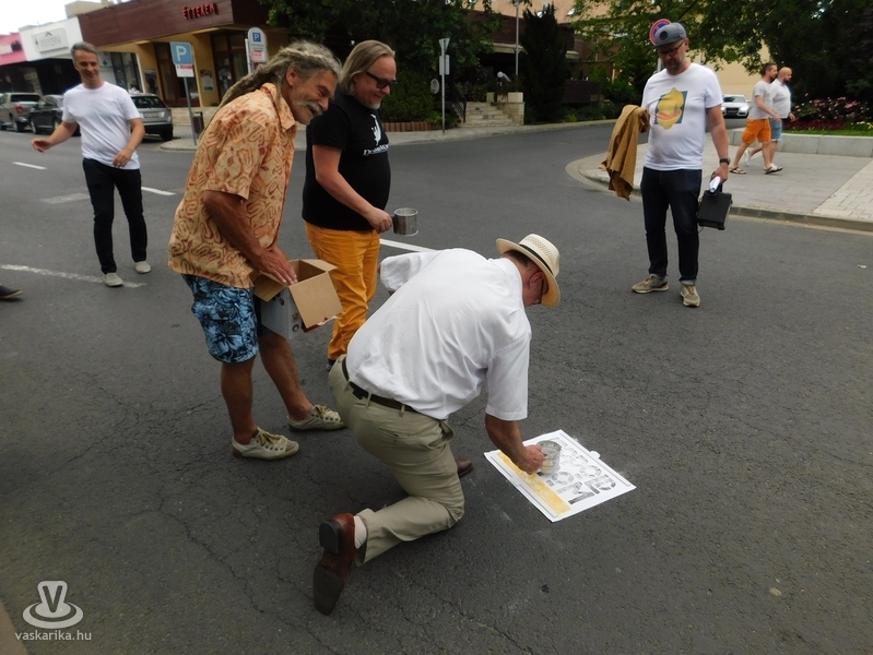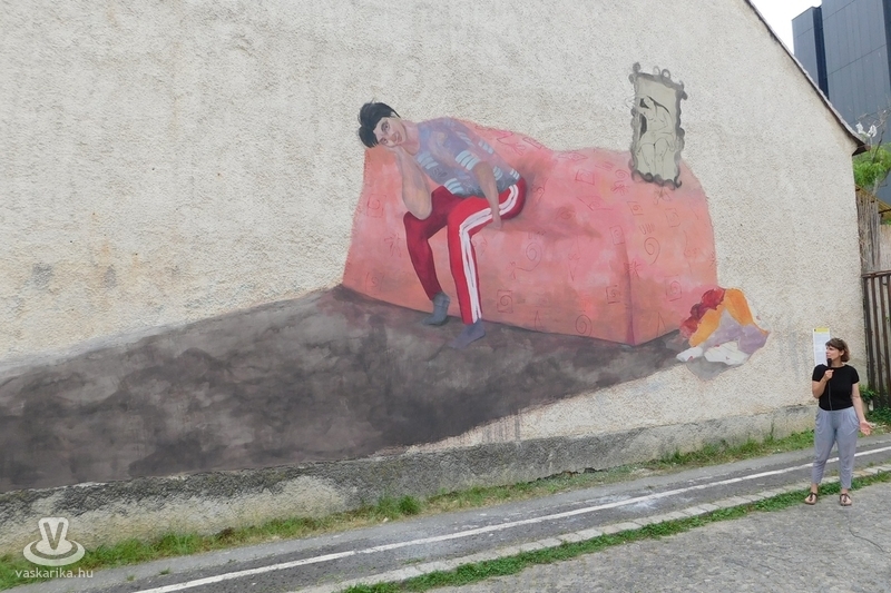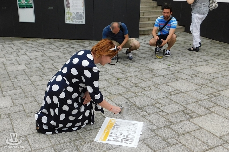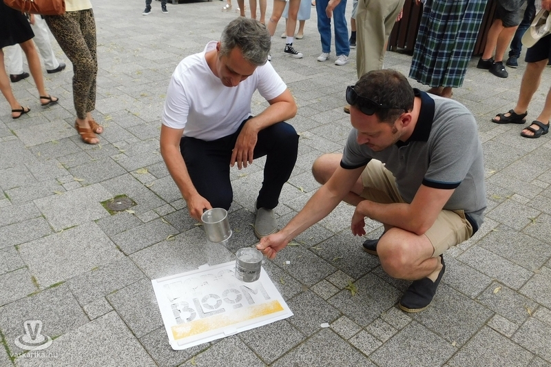 Ezután a porcukros pecsételés következett, melyet Nemény András és Ronan Gargan indított, majd többen is részt vettek benne, míg eljutottunk a Murális Műhely projekt helyszínére, a Zrínyi utca - Batthyány térre. Aideen Barry képzőművész Írországból a műhely-sorozat harmadik faliképét készítette el a regény harmadik fejezete, a Próteusz alapján. Munkájának címe: Az észlelés óhatatlan módjai. Szántó Eszteré a negyedik fejezet volt, a Kalüpszó, az ő faliképének címe: Molly Bloom. A festmények érdekessége, hogy egy alkalmazás segítségével okostelefonokkal animálható.