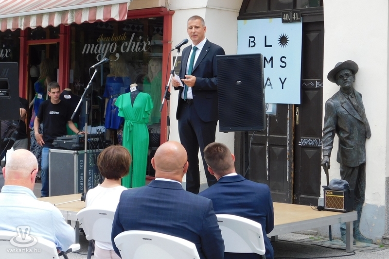 Június 16-án végre karanténtól mentesen kezdődhetett a kétnapos Bloomsday Szombathelyen. Ha a járványtól nem is kellett tartani, az időjárásjelentés által megjósolt zivatar ott lógott a levegőben, ám ez sem a résztvevőknek, sem a lelkes közönségnek nem szegte kedvét. Az ír és magyar himnusszal indult program, Holdosi Attila és Ujvári Tímea tolmácsolásában hallhattuk. Ezután Nemény András polgármester köszöntötte az egybegyűlteket. Megemlékezett az elmúlt két évről, amikor nem lehetett a megszokott formában ünnepelni, ám 2020-ban készítettek egy videót, ahol többen felolvastak az Ulyssesből. A polgármestert megragadta a transzszubsztanciális szó, hiszen ez többjelentést takar. Utal arra, hogy a változásban létezik egy állandó elem, de van benne valami, ami azon túlmutat. A szombathelyi Bloomsday ünnepen a valóság és fikció elválaszthatatlanul egymásra épül. Az Ulysses maga fikció, ám Szombathely és a Bloom ház, ahol a regény szerint Leopold Bloom (Virág Lipót) született valóságos. A regény egy fiktív időben játszódik, amit viszomnt mi a valóságban ünneplünk.