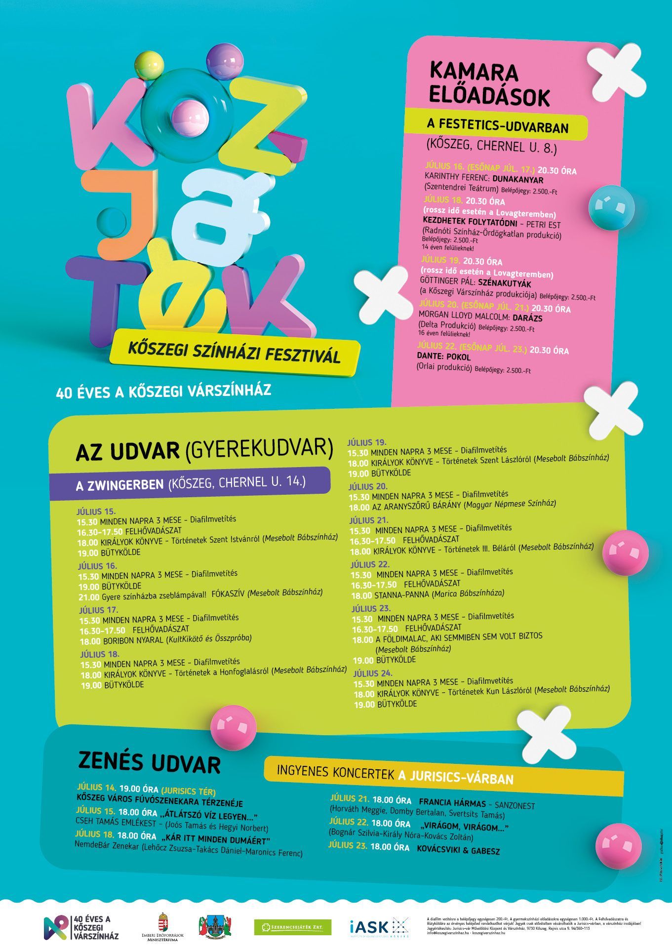 A Köz-Játék Színházi Fesztivál július 14-én kezdődik, július 24-ig tart. „Ebben a tíz napban a nagyszínpadi produkciók mellett gyerekudvart nyitunk a gyerekelőadásokhoz, kamaraudvart a kisebb színházi produkciókhoz és egy zeneudvart is", jegyzi meg Pócza Zoltán. A fesztivál idején, július 19-én mutatja be a Kőszegi Várszínház a Szénakutyák - képzeletbeli dokumentumjáték Weöres Sándor macskájáról című darabot, amelyet Kálid Artúr ad elő. Göttinger Pál rendezőként, szerzőként is jegyzi a művet, amelyet Weöres Sándor műveinek és élete dokumentumainak a felhasználásával írt. Másnap, július 20-án Morgan Lloyd Malcolm Darázs című darabjának az ősbemutatója lesz Ördög Tamás rendezésében. Szereplők: Sodró Eliza, Kiss-Végh Emőke. A Delta Produkció előadása.