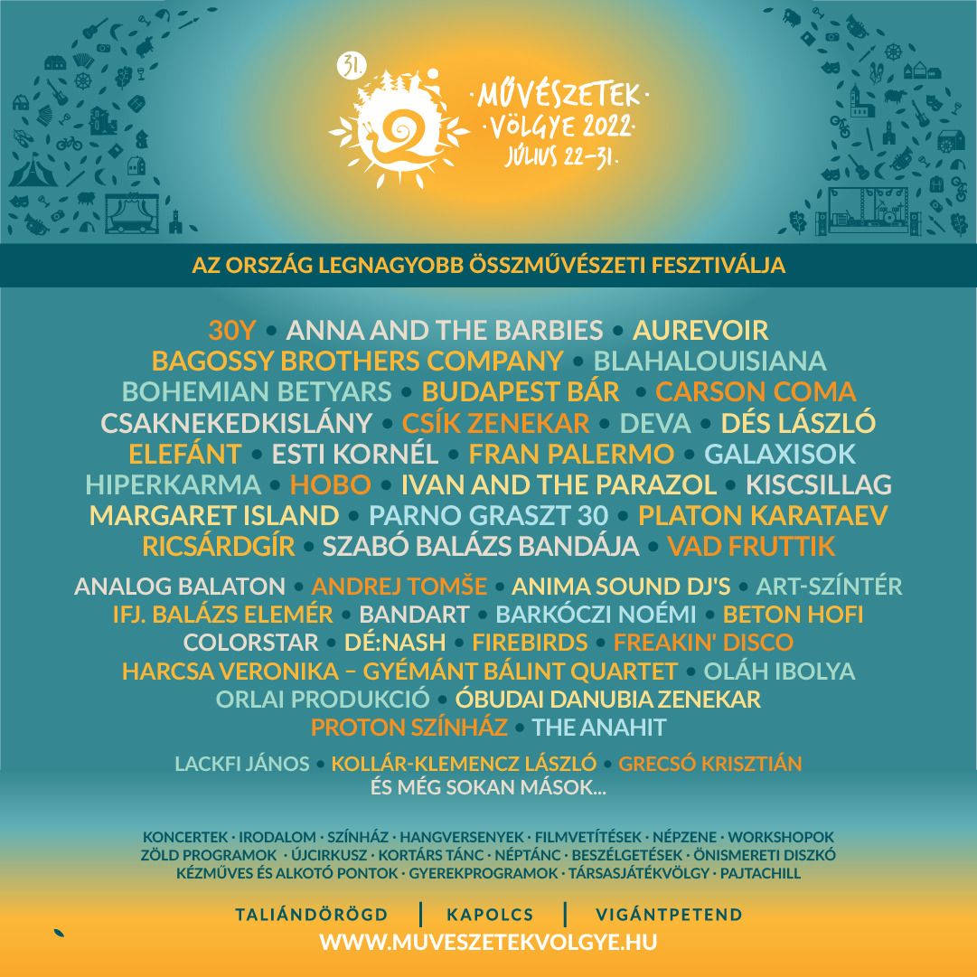 Július 22-én elindult a Művészetek Völgye Fesztivál, ahol egészen július 31-ig 2000-nél is több programmal várják a fesztiválozókat Kapolcsra, Vigántpetendre és Taliándörögdre. A koncertek mellett már az első napon színházi bemutatóval, a Mr. és Mrs. premierjével várják a nagyérdeműt, de a 10 nap alatt rengeteg színházi, újcirkuszi, kortárs irodalmi produkció, kézműves vásár, izgalmas beszélgetések, workshopok, kiállítások, bringatúrák, sőt terepfutó verseny is lesz az ország legnagyobb összművészeti fesztiválján.