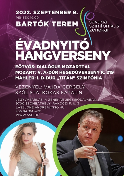 Eötvös Péter, Mozart és Mahler egy-egy műve szerepel a Savaria Szimfonikus Zenekar szeptember 9-i évadnyitó hangversenyén. A Petró János bérlet első előadásán szólistaként fellép Kokas Katalin hegedűművész, a zenekart Vajda Gergely vezető karmester vezényli.
