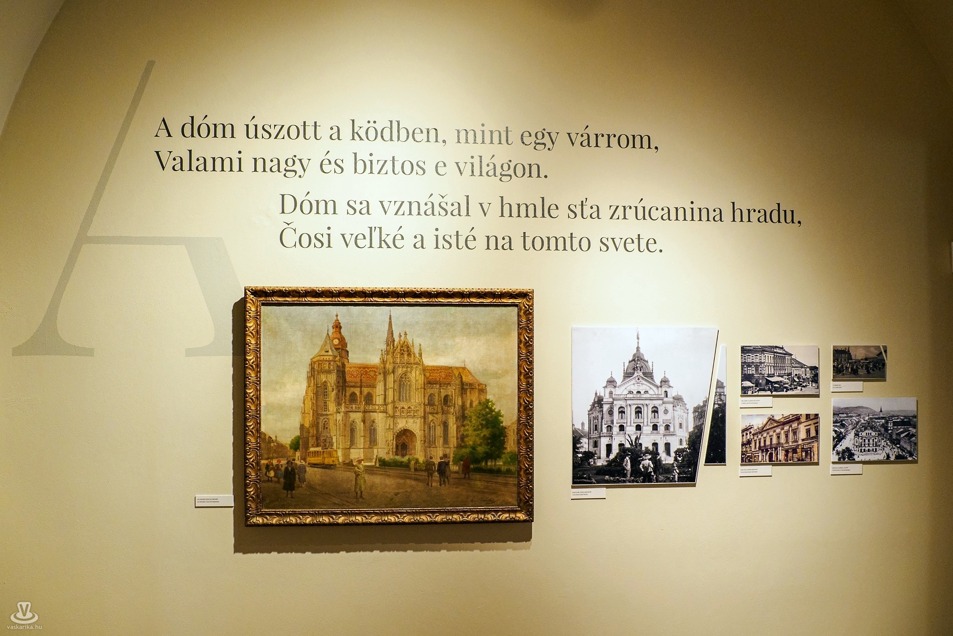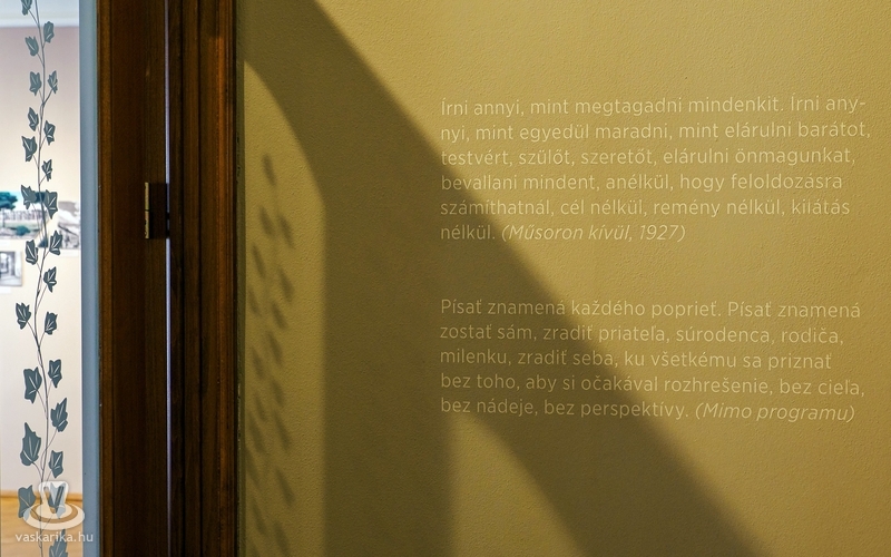 A polgári-európai hagyományok, a polgártudat vállalhatósága határozta meg írói pályáját. A „szülői ház" értékrendje meghasadt, eltört, ezt a kiállításon a fotók egyik sarkának levágása és illesztése szimbolizálta. Az első fényképen a kassai dóm látható, mellette idézet az író Cassovia című verséből: „A dóm úszott a ködben, mint egy várrom, / Valami nagy és biztos e világon"
