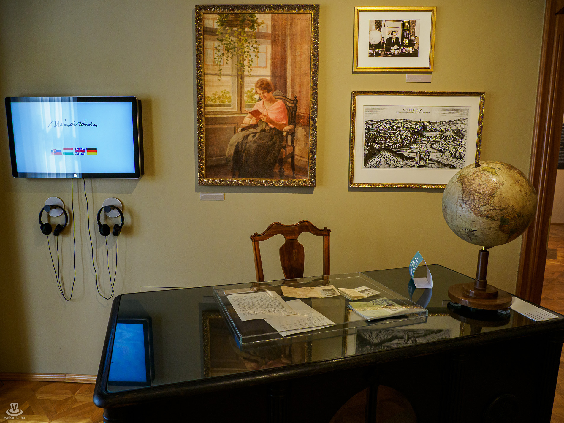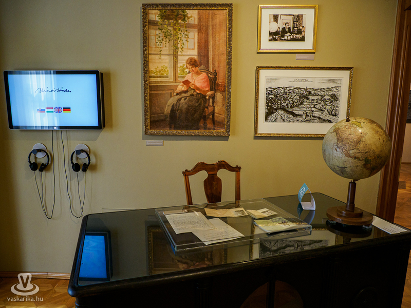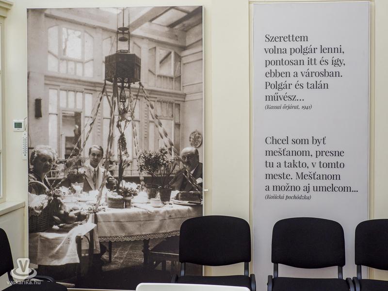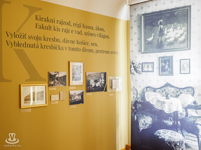 Az első szobában Kassa „lábunk alatt" hevert, hiszen a szőnyeg, amelyre léptünk, Kassát ábrázolta a XX. század elején. Megtaláltuk a Mészáros utcát, ahová az író emlékei szerint az ezerkilencszáztízes évek közepe táján költöztek, és ahol most a Márai Sándor Emlékkiállítás van.