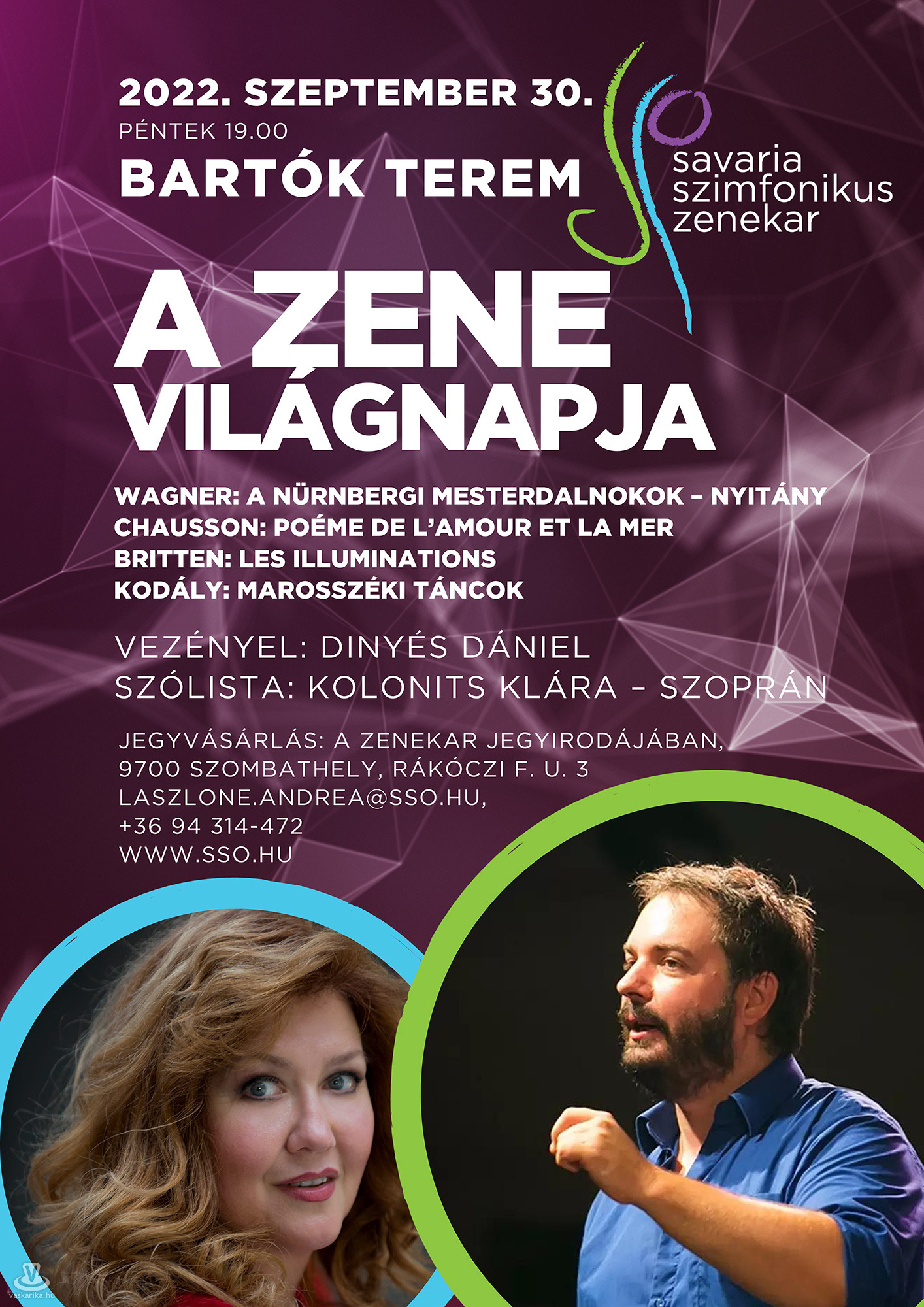 Négy darabot hallhat a Bartók Terem közönsége a Zene Világnapja alkalmából szeptember 30-án, a Savaria bérlet nyitóhangversenyeként. Vendégszólistaként fellép Kolonits Klára Kossuth-díjas opera-énekesnő, a Magyar Állami Operaház kamaraénekesi címmel kitüntetett magánénekese, a Halhatatlanok Társulatának örökös tagja, a nyitóhangversenyt vezénylő Dinyés Dániel karmester felesége.