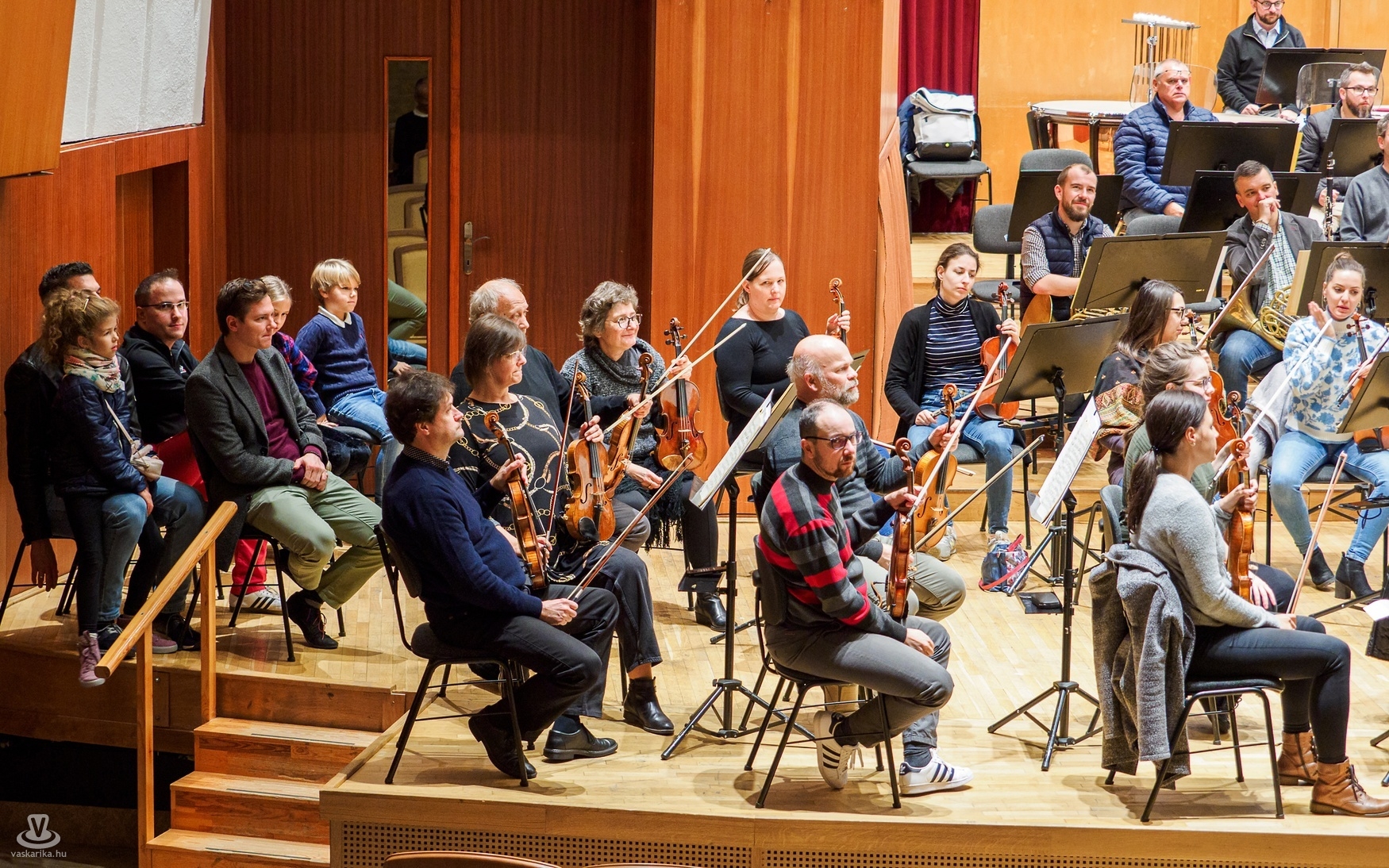 Felütésként ki is hívott a zenekar mögé elhelyezett székekre a közönség soraiból arra kíváncsiakat, hogy hogyan szól a zenekar a színpadon. Hiszen a hangversenyen senkinek sincs lehetősége a zenekar játékát innét hallgatni! Cserélődött is a hat szék, egymásnak adták a helyeket kicsik és nagyok.