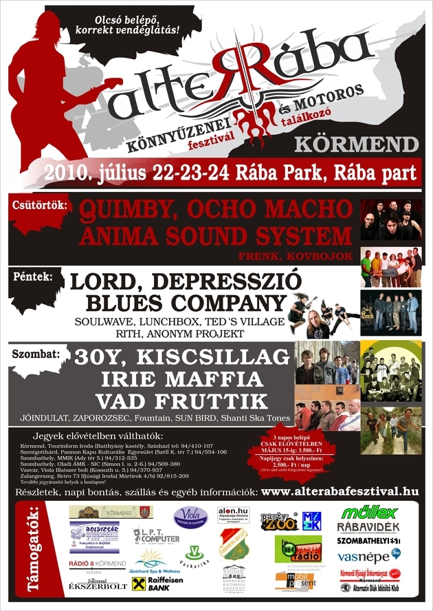Még egy hétig válthatsz kedvezményesen jegyet a körmendi Alterába Fesztiválra! Mindenki ott lesz, aki számít: 30Y, Quimby, Vad Fruttik, Kiscsillag, Irie Maffia, Anima Sound System, Depresszio, Lord, Ocho Macho, és a többiek... 3 nap, több mint 25 fellépő, és sok-sok új barát. Végre egy könnyűzenei fesztivál a pénztárcádhoz igazítva!