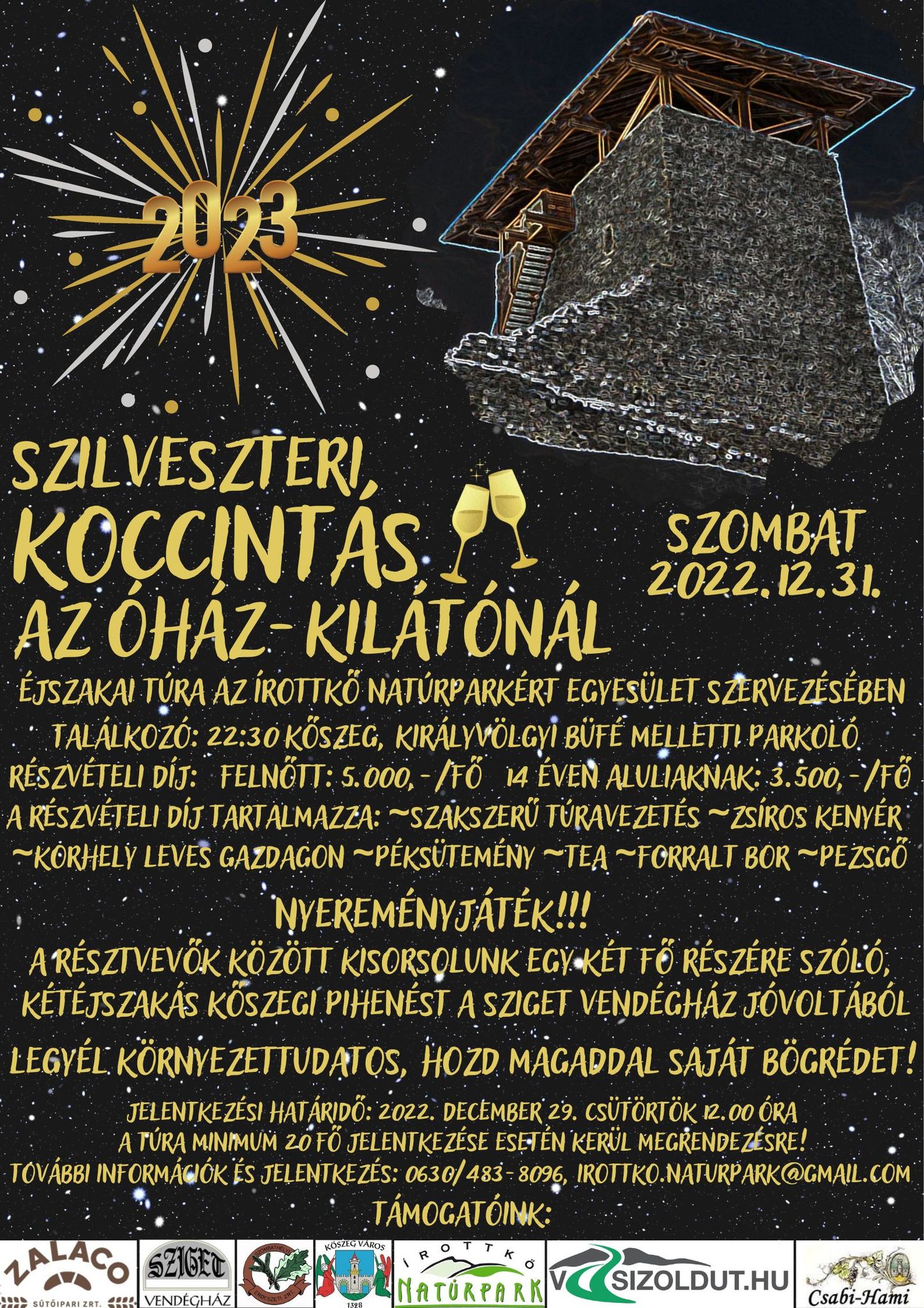 "Szilveszteri koccintás az Óház-kilátónál" éjszakai túrával készül az év utolsó napjára az Írottkő Natúrparkért Egyesület. Az elmúlt évek nagy sikerén felbuzdulva úgy döntöttek, idén ismét megrendezik önkénteseik segítségével a népszerű túrát, melyet "csomagajánlatként", szilveszteri ellátással együtt ajánlanak a kalandvágyóknak az óév utolsó éjjelén. Jelentkezni december 29-én délig lehet!