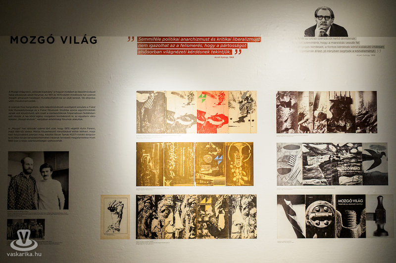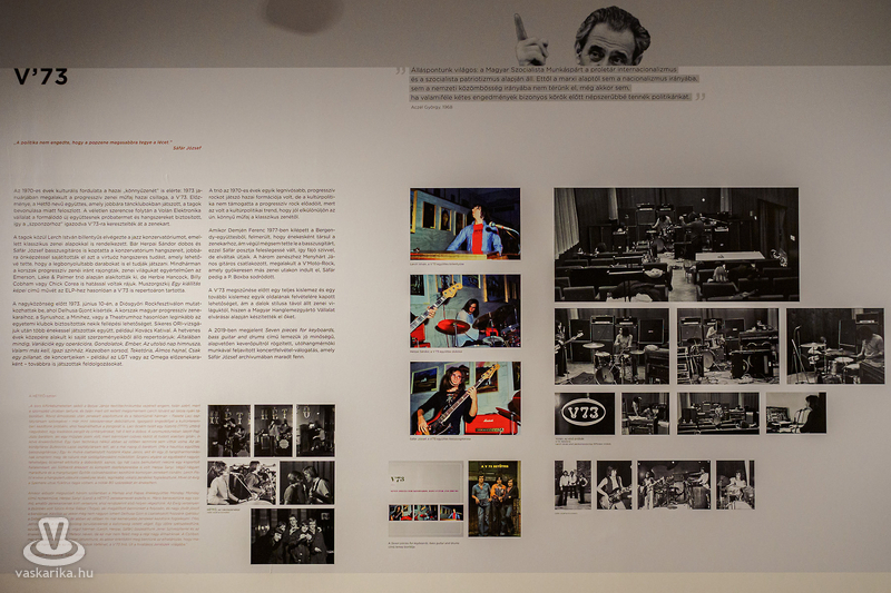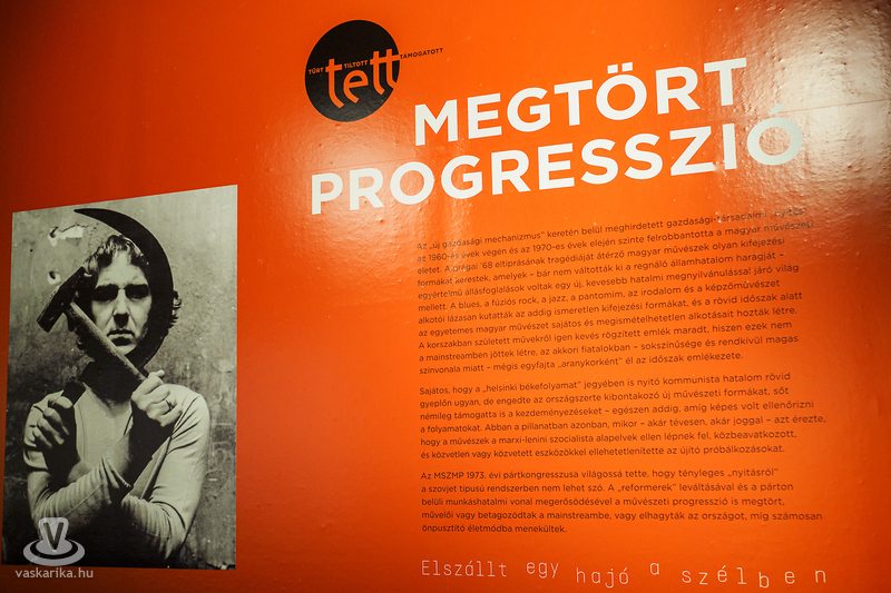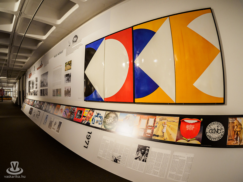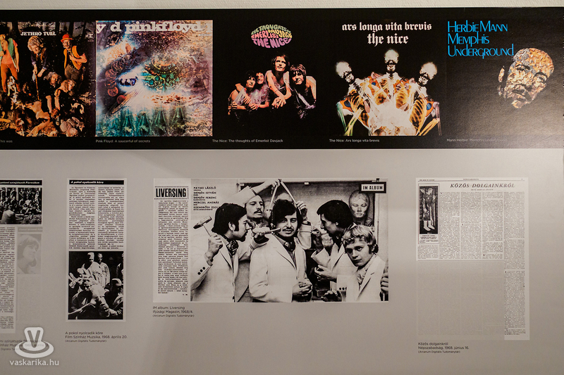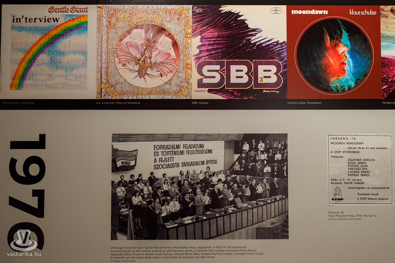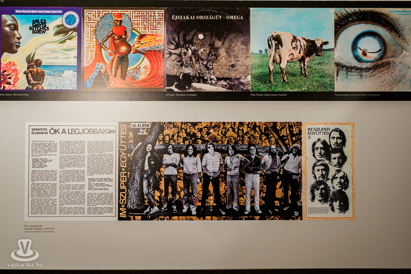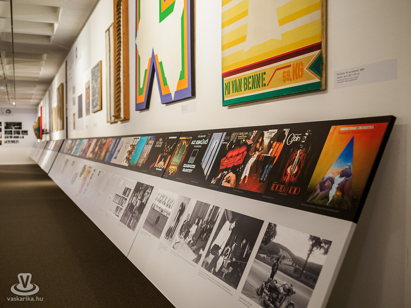 A szombathelyi inkább szöveges tablókon, fényképekkel megerősítve „meséli el a történetet". Ugyanakkor egy szenzációs fotósorozat, méretiben is hatalmas, mennyezetig érő kivitelben mutat be jó néhány zenészt, (Szörényi Levente, Török Ádám, Dés László, Tátrai Tibusz, Ráduly Mihály, Sebő Ferenc) vagy színészt (Jordán Tamás) a pályakezdéskori, és jelenleg készített portréin keresztül. A kor hanglemezborítói - melyek akkoriban sokkal többek voltak egy lemezt őrző tasaknál, zömében képzőművészeti alkotások, vagy azzal felérő munkák voltak - a vasi helyszínen az egész hatalmas termet körbeölelik, sokszáz tasakot bemutatva. Örömmel fedeztem fel, hogy a szombathelyi nemcsak a hazai, hanem a hazai alapjául szolgáló nemzetközi trendeket is felidézi, szintén hatalmas borítóáradattal, szemmagasságban. A King Crimson vagy a Keef Hartley Band debütáló lemezei, Frank Zappa LP-i messziről feltűntek, de alapos figyelés mellett a Közép-Kelet-európai progresszió nagyjainak, a pozsonyi Collegium Muzikumnak, a lengyel SBB-nek korongjaira is ráakadhattunk.