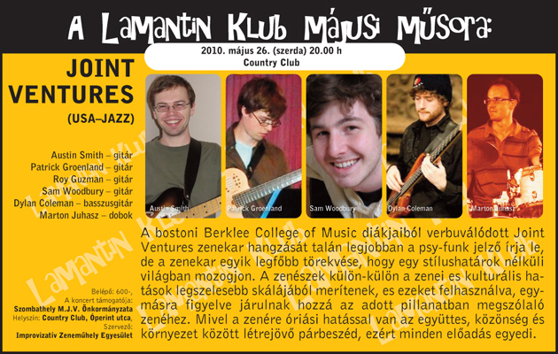 Május 26-án este 20 órakor egy igazi zenei csemegével várja vendégeit a Lamantin Club. Egyenesen az Egyesült Államokból hozzák a jazzt a Joint Ventures tagjai. Négy gitár, melyet a dob és a basszusgitár tart kordában, vagy éppen repít az improvizáció szárnyán. A zenére óriási hatással van az együttes, közönség és környezet között létrejövő párbeszéd, ezért minden előadás egyedi. Kezdés: 20 órakor, belépő mindössze 600 Ft.
