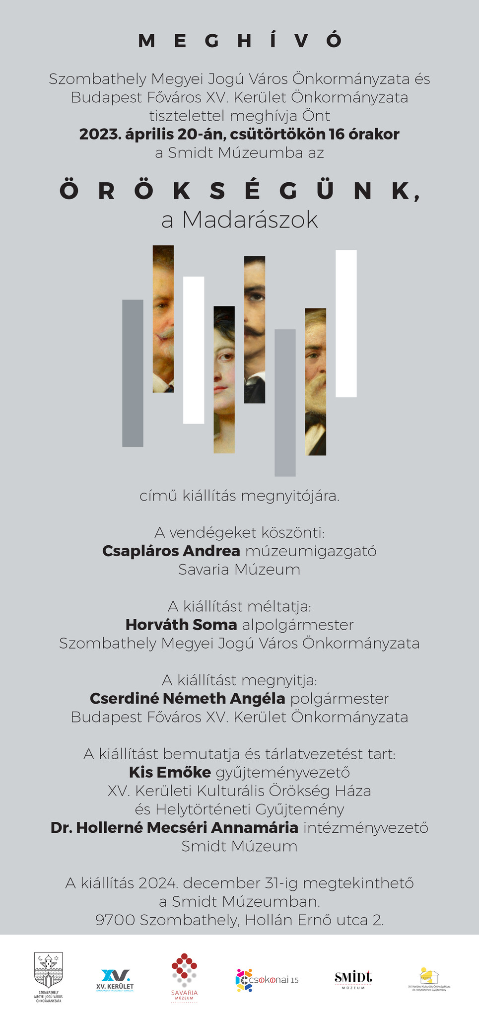 Április 20-án nyílik meg a Smidt Múzeumban a Madarász Viktornak és Madarász Adeline-nek emléket állító időszaki kiállítás, amely a legnagyobb magyar historikus festő és lánya hagyatékából válogat. Festmények, személyes tárgyak és dokumentumok segítenek felidézni életútjukat, művészi pályájukat és kettejük kapcsolatát. A kiállítás műtárgyai Budapestről, a XV. Kerületi Helytörténeti Gyűjteményből érkeznek a Smidt Múzeumba, amely saját gyűjteményéből származó emlékekkel egészíti ki az összeállítást. Az Örökségünk, a Madarászok című időszaki kiállítás Szombathely Megyei Jogú Város és Budapest Főváros XV. kerülete, valamint a Csokonai Nonprofit Kft., a XV. Kerületi Kulturális Örökség Háza és Helytörténeti Gyűjtemény, a Savaria Múzeum és a Smidt Múzeum együttműködésével valósul meg.