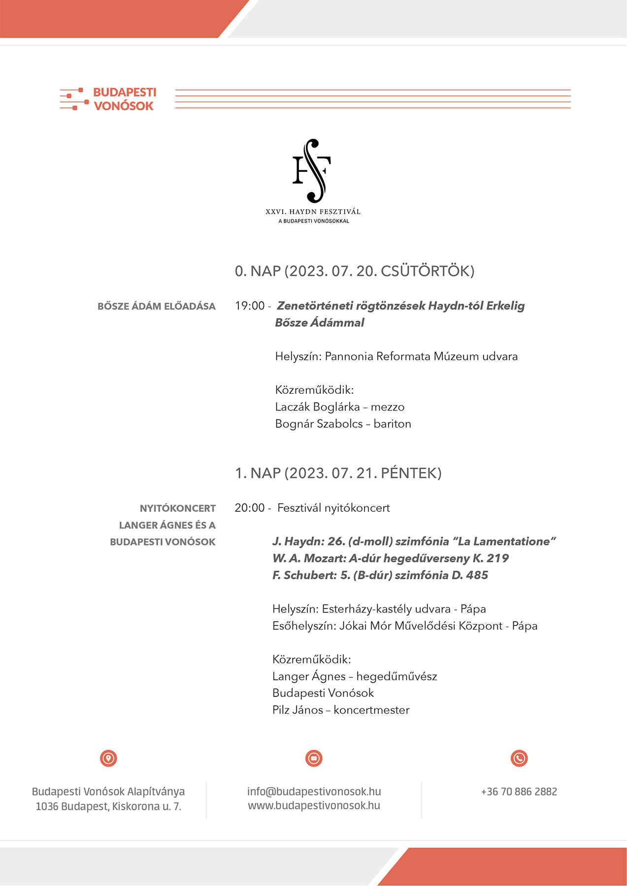 A pénteki nyitóhangversenyen az érzelmek kavalkádját élhetjük át, a megszólaló változatos művek néhány évtizedet ölelnek fel. A Budapesti Vonósok előadásában elhangzik Haydn 26. d-moll szimfóniája, és Schubert V. szimfóniája, valamint a két mű között Mozart A-dúr hegedűversenyét hallgathatjuk meg Langer Ágnes hegedűművész és a zenekar előadásában. Koncertmester: Pilz János.