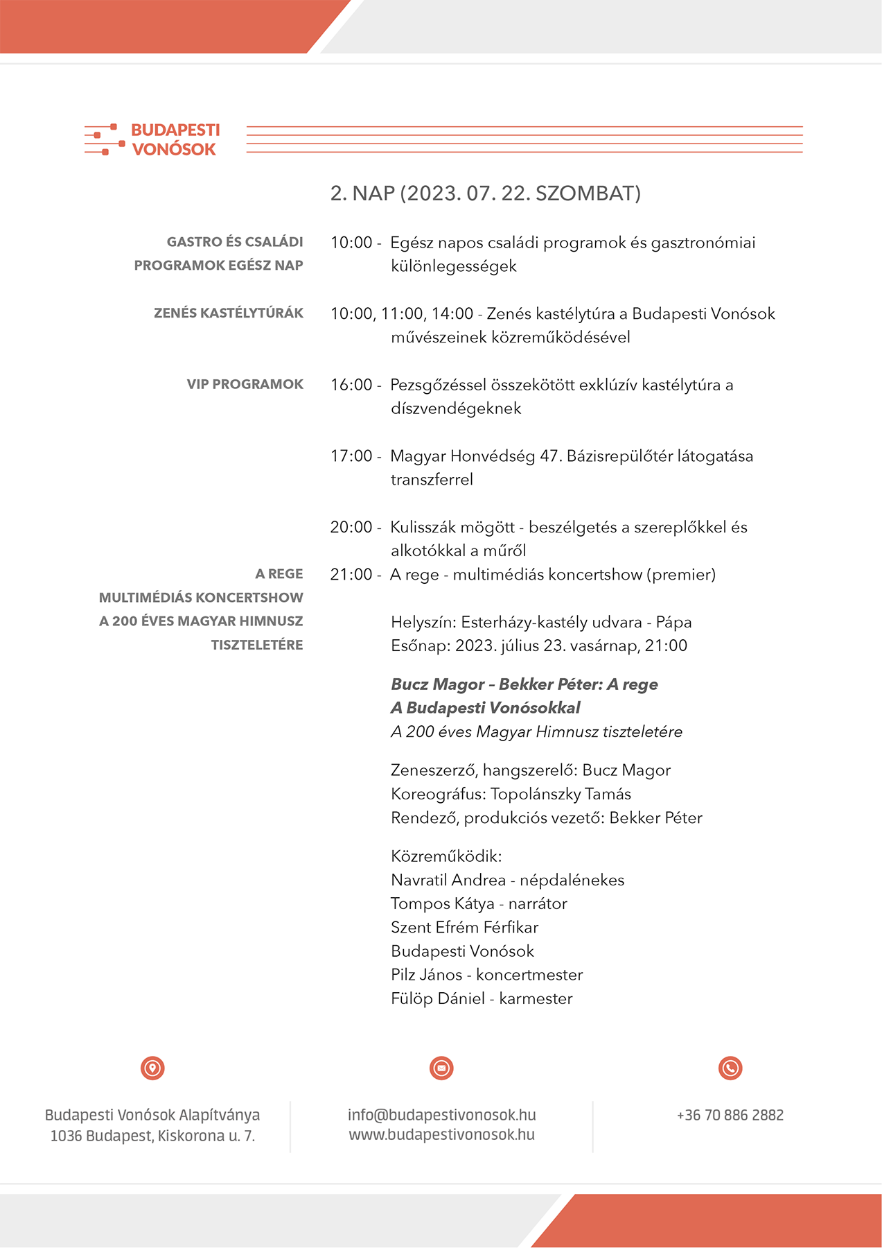 Nem mindennapi programmal készül a Budapesti Vonósok az idei Haydn Fesztivál szombat esti hangversenyére. Kétszáz éves nemzeti imádságunk, Kölcsey Himnusza tiszteletére Bucz Magor és Bekker Péter multimédiás koncertshowt álmodott meg az Esterházy-kastély udvarára, amelynek ősbemutatójára kerül sor. A nagy múltú kamarazenekar olyan kiváló előadókkal osztja meg a színpadot, mint Tompos Kátya színésznő, Navratil Andrea népdalénekes, valamint a Szent Efrém Férfikar. A nyolcvanperces zenei utazás során - amelynek A Rege címet adták az alkotók - a Himnusz versszakai alapján elevenedik meg előttünk a magyar nép története. A show-ban közreműködik a GG Tánc Eger, koreográfus Topolánszky Tamás.