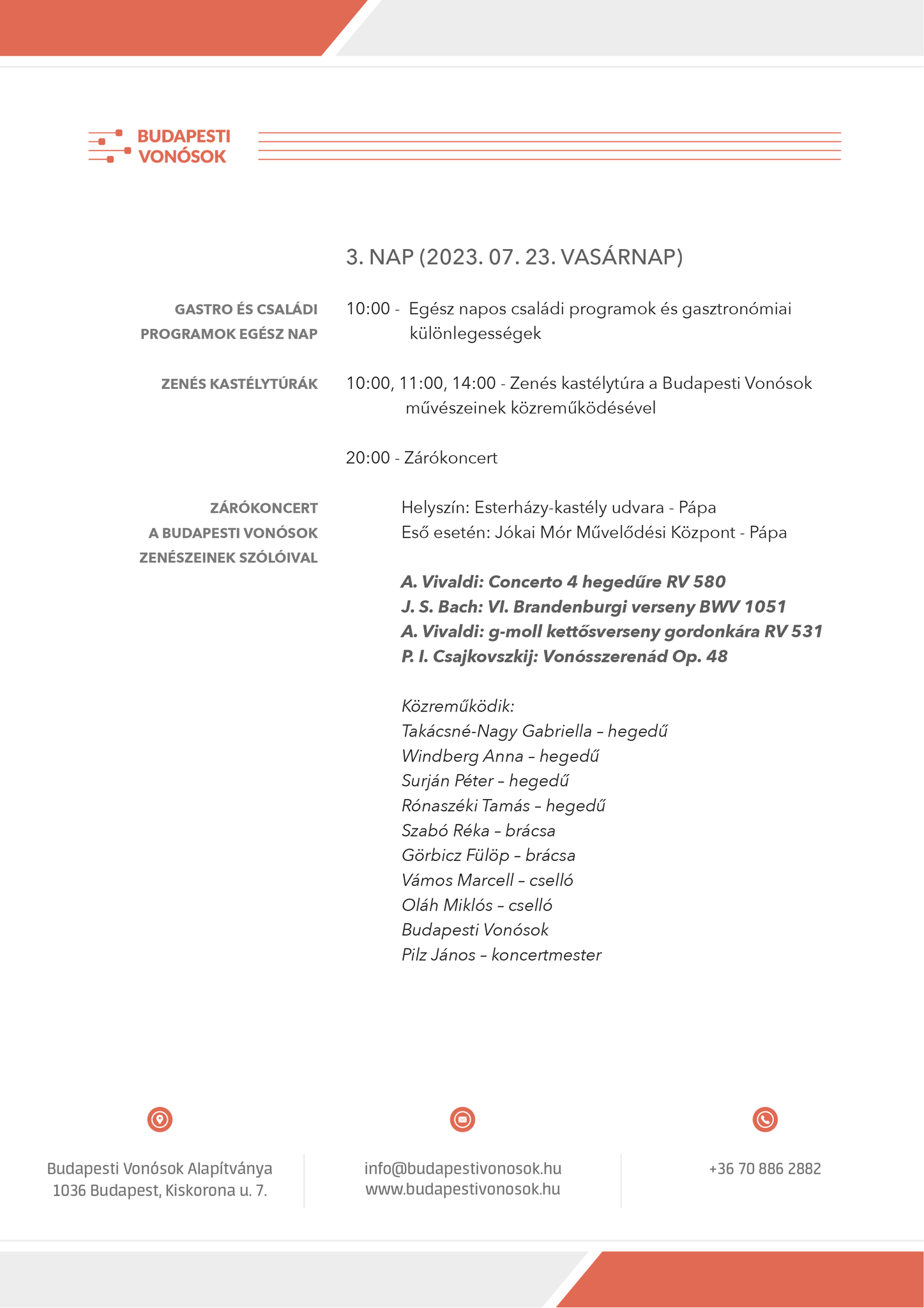 Az idei pápai Haydn Fesztivál vasárnap esti záróhangversenyének különlegességét az adja, hogy a Budapesti Vonósok együttesének tagjait közelebbről, szólistaként is megismerhetjük. A zenekar műsorán olyan jól ismert, művek szólalnak meg, mint Bach VI. Brandenburgi versenye vagy Csajkovszkij Vonósszerenádja, de Vivaldi több szólistát igénylő, fülbemászó versenyműveivel is találkozhatunk a koncerten.