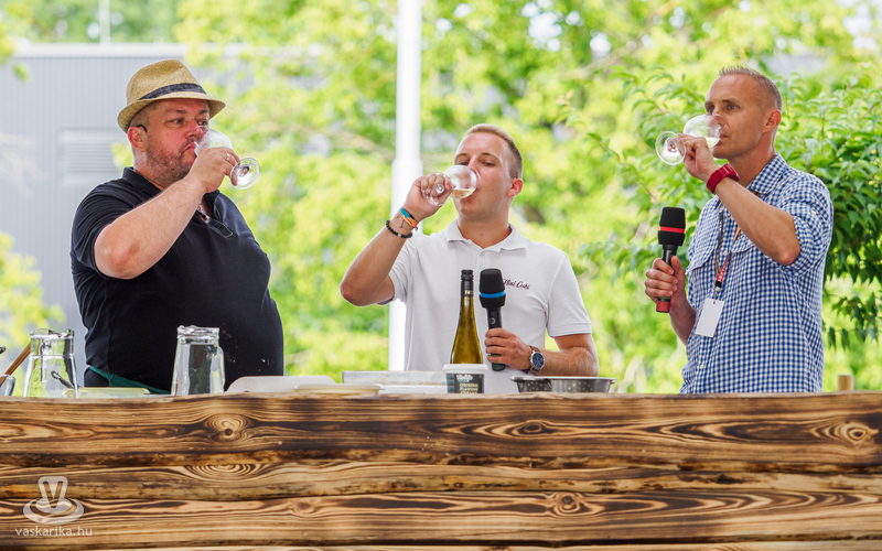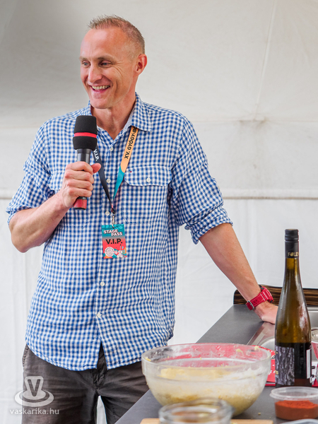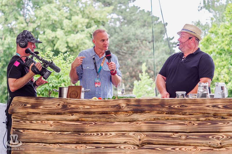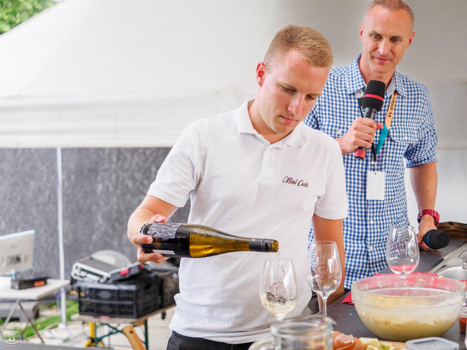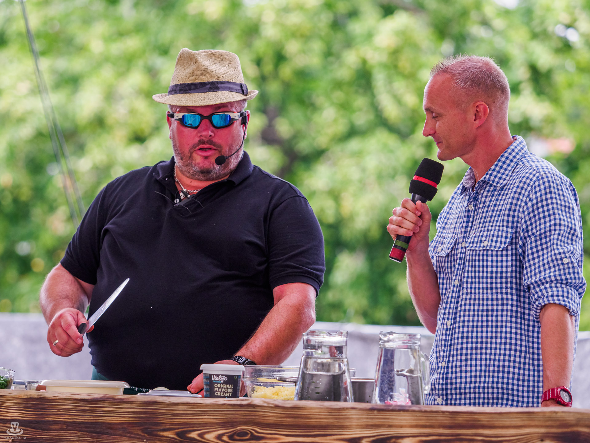 Szögezzük le az elején: minden főzés alapja, hogy igyunk valamit előtte. A séfet, aki ezúttal Nika Róbert volt, itatni és beszéltetni kellett, hogy jó hangulat legyen. Előbbiről a jóféle bor gondoskodott, utóbbiról Szép Bence humorista, aki a főzőkanáltól kellő távolságot tartott, ellenben a szpícset igazi old school stand up-os módjára tolta. Égett is az „anyag" - szerencsére nem le - Robi keze alatt! A szerdai főzés alapanyaga a nyúlhús volt, ami rendkívül egészséges és fesztiváligazgatói kérésre került a gasztrofesztivál kínálatába.