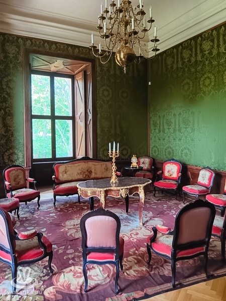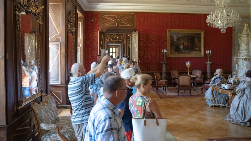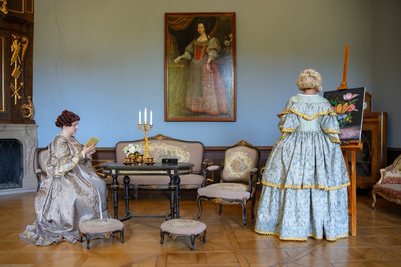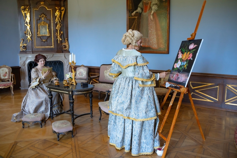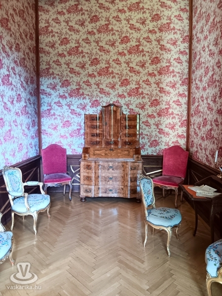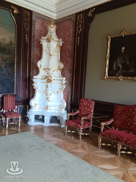 A kápolna megtekintése után a főúri lakosztályok felé vezetett utunk. A vörös, zöld szalonok a szórakozás, a pihenés és a társasági élet fontos helyszínei voltak. A szalonok berendezése, bútorai gyönyörűek, különösen a hatalmas velencei tükrök, amelyek a teret még nagyobbá varázsolják. Az ablakok fazsalugáterei aranyozottak a főúri lakosztályokban. A szalonokban a korra leginkább jellemző fehérmázas cserépkályhák találhatók. Minden helyiségben találkoztunk a korhű ruhába öltözött vendéglátókkal vagy más vendégekkel, akik éppen kávéjukat kortyolgatták vagy beszélgettek.