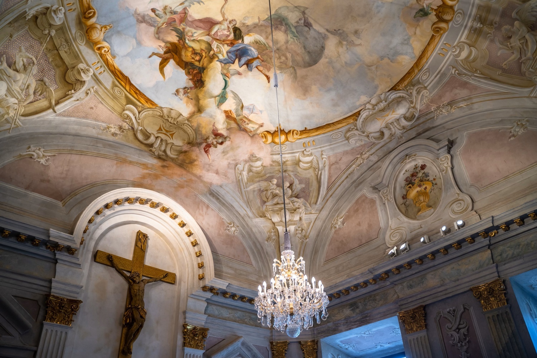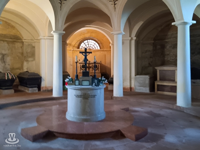 A kör alaprajzú központi kripta az itáliai keresztelőkápolnákat idézi. Nyolc karcsú oszloppal tartott kupolás középrésze van, és csehboltozatos kerengőjéről közelíthetők meg a szarkofágokat és koporsókat tartalmazó oldalfülkék. A középső rész szintje kissé mélyebb, centrumában kör alaprajzú márványoltáron kettős korpusz helyezkedik el.