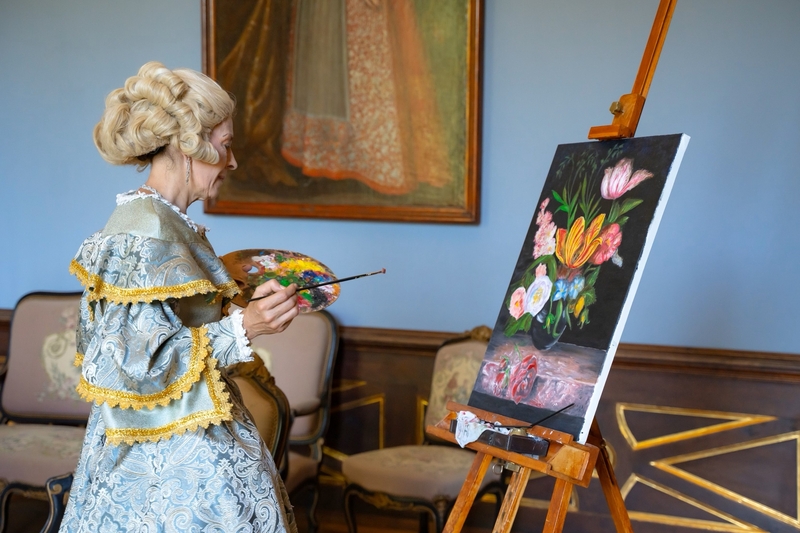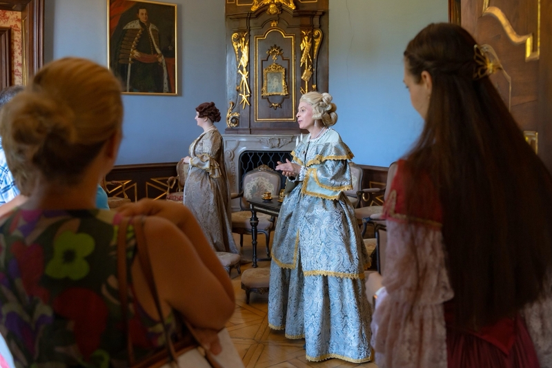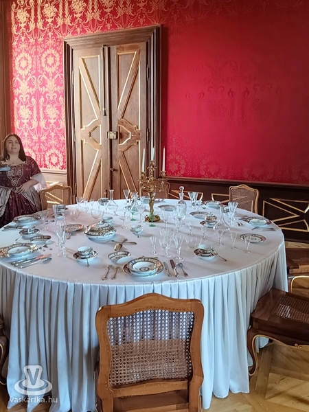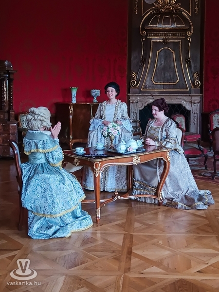 A filmvetítés után a kastély úrhölgye fogadott bennünket, természetesen barokk ruhában és a korabeli francia divatnak megfelelő parókában. Házi áldást kért mindenki számára, aki a küszöbön belépett, hogy útját a kastélyban szerencse, boldogság kísérje.