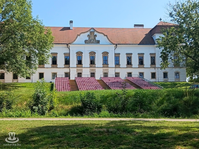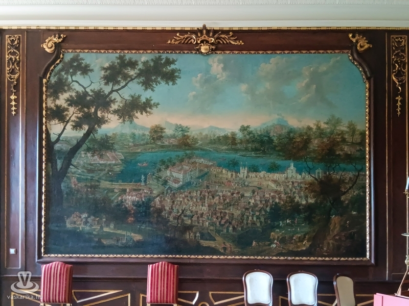 Pápa központja felé haladva először a Római Katolikus Nagytemplom tornyai tűntek fel. A Fő tér felől közelítve elértük az Esterházy-kastély nyugati szárnyát, majd a kastély udvarra csodálatos kovácsoltvas díszkapun át léptünk be. A nyugati szárny azért különleges, mert - mint a tárlatvezetésen megtudtuk -, itt volt a tulajdonos magánlakosztálya. Az egyemeletes barokk kastély egyébként az ún. versailles-i kastélytípusba tartozik.