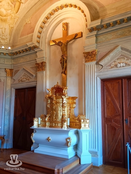 A tárlatvezetés a kastélykápolna megtekintésével folytatódott. Az keleti szárny végében található nyolcszögletű kápolna érdekessége, hogy a Főúri lakosztályok között foglal helyet. A kápolna páholyát nem magasított erkélyen helyezték el, hanem oszlopokkal elkerített helyen. A kápolna falait Joseph Ignaz Mildorfer freskói díszítik. A lapos kupolát tartó boltívek ívháromszögében angyalfigurák tartják Jézus szenvedésének relikviáit: a töviskoszorút, a kalapácsot a szegekkel, a lándzsát és a kelyhet.