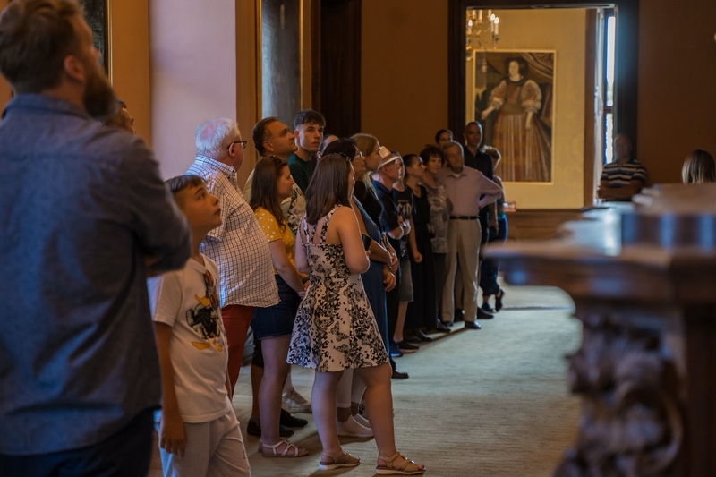 Az Ősök Csarnokát 1860-ban Esterházy Pál építtette. A csarnok falain az Esterházy család tagjainak portréi láthatók. Az Ősök Csarnokának megtekintésével látogatásunk a végére ért, így vendéglátó úrhölgyünk jókívánságait meghallgatva, a barokk pompájú, kőkorláttal és stukkós mennyezettel pompázó lépcsőházba léptünk.
