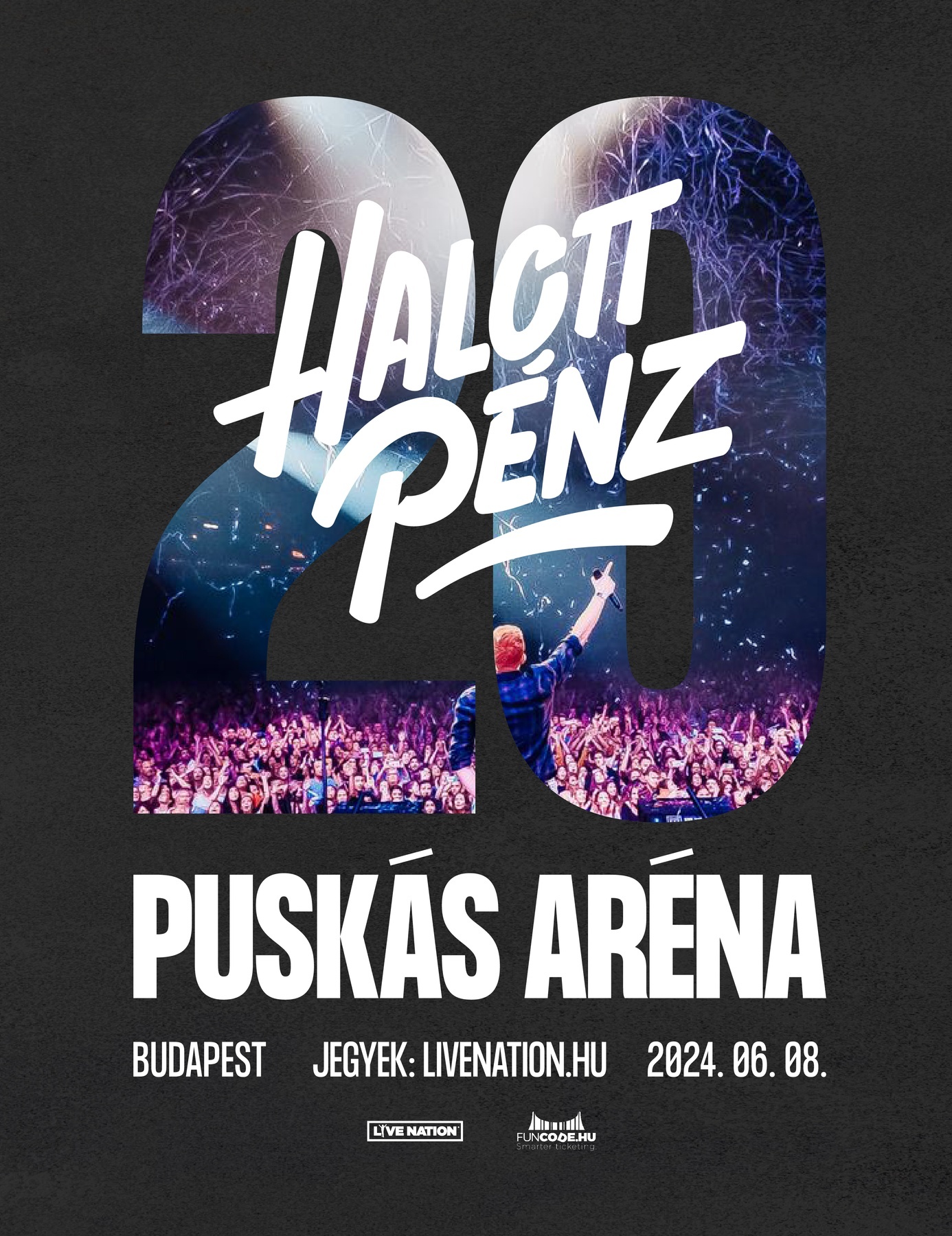 Az ország egyik legnépszerűbb zenekara, a Halott Pénz 3 teltházas Budapest Aréna és 12 teltházas Budapest Parkos koncert, rengeteg sláger és szakmai díj után emeli a tétet, és 2024. június 8-án a Puskás Arénában a rajongóikkal együtt egy felejthetetlen show-val ünnepli meg 20. születésnapját.