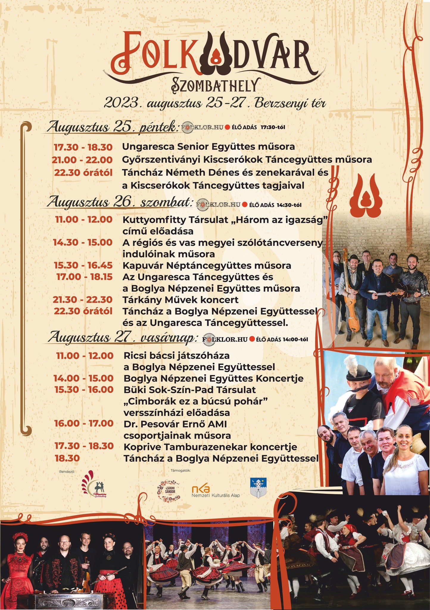 Ismét Folkudvar a Savaria Karneválon a Berzsenyi téren! A folklórforgatagban a néptánc és a népzene játssza a főszerepet, olyan nagyszerű zenekarok fellépése mellett, mint a Koprive Tamburazenekar és a Tárkány Művek. Esténként táncház zárja a rendezvényt.