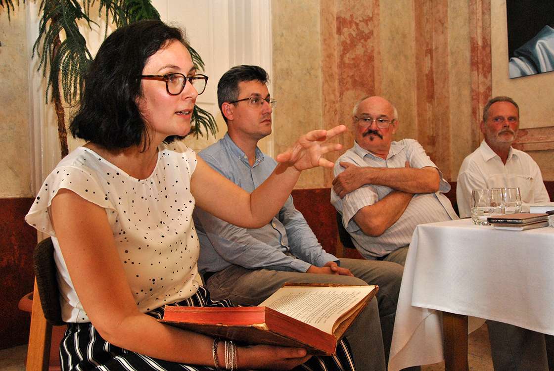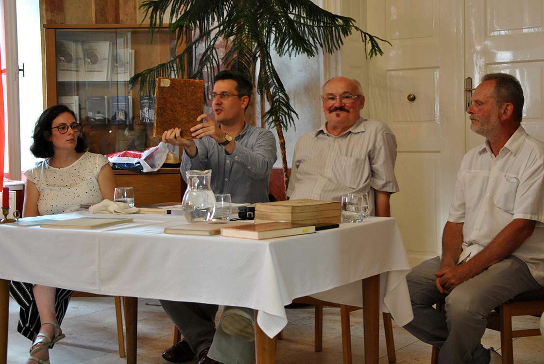 Dr. Sánta Sára történész, Rétfalvi Balázs levéltárvezető Schönvisner művének egy példányával, Feiszt György nyugalmazott főlevéltáros, Mayer László levéltáros
