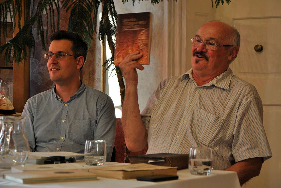 Rétfalvi Balázs és Feiszt György - kezében Takács Ince Sabaria Franciscana című művével, de szó esett Horváth Tibor Antal kötetéről is.