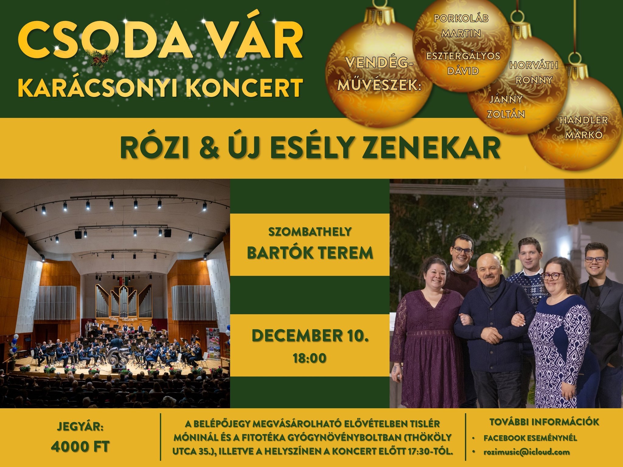 Tislér Mónika Rózi és az Új Esély Zenekar szervezésében "Csoda vár" címmel csendül fel először a Bartók Teremben december 10-én, vasárnap este hat órakor egy különleges koncert, amire nagyon sok szeretettel várnak minden kedves érdeklődőt!