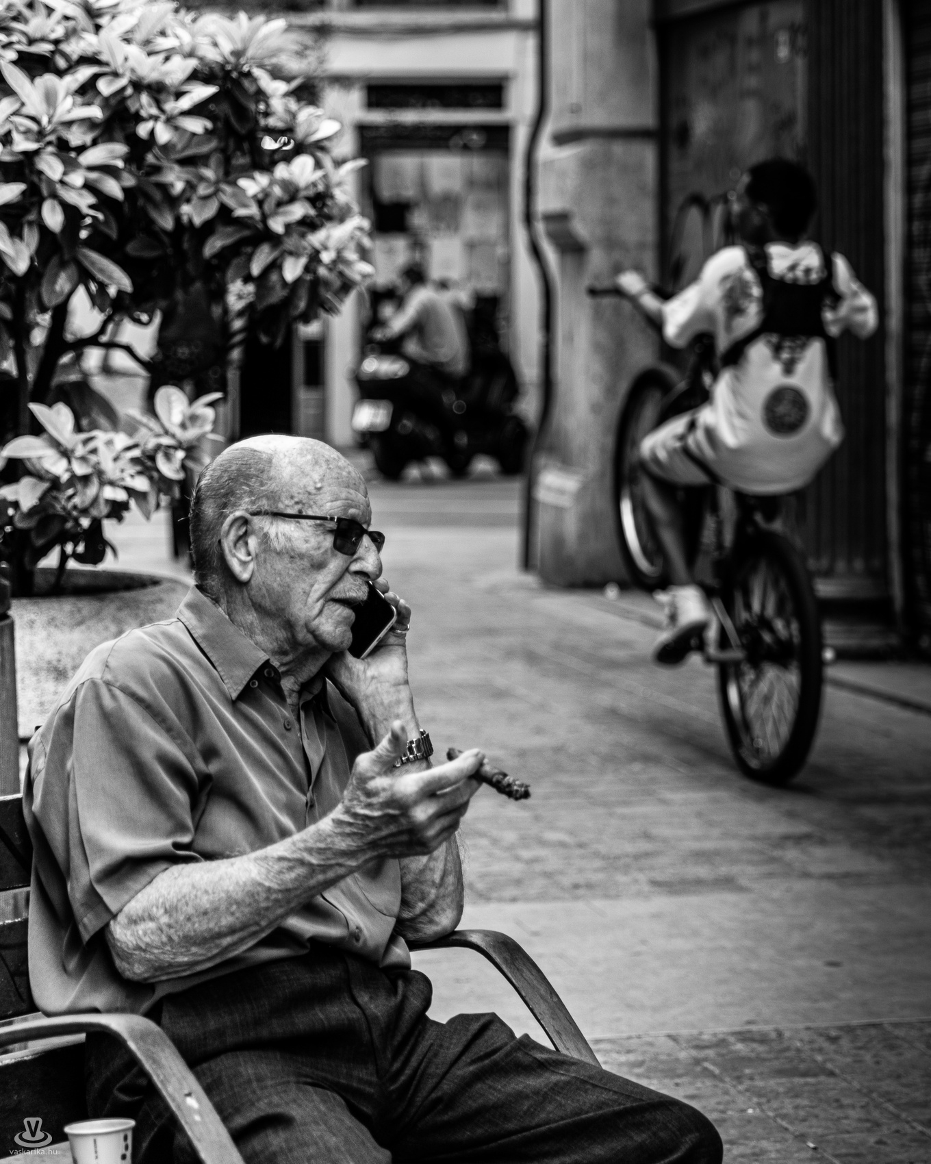 Egyik kedvenc városomban készült a kép, egy eldugott sikátorban. Pont ezek miatt a szivarillatú, árnyékos utcák miatt olyan kedvesek nekem Spanyolország nagyvárosai. Számomra a szivarozó, elegáns, idős úr és a háttérben bringáján trükköző fiatalember kontrasztja és harmóniája adja a kép és egyben Valencia nagyon szerethető stílusát.