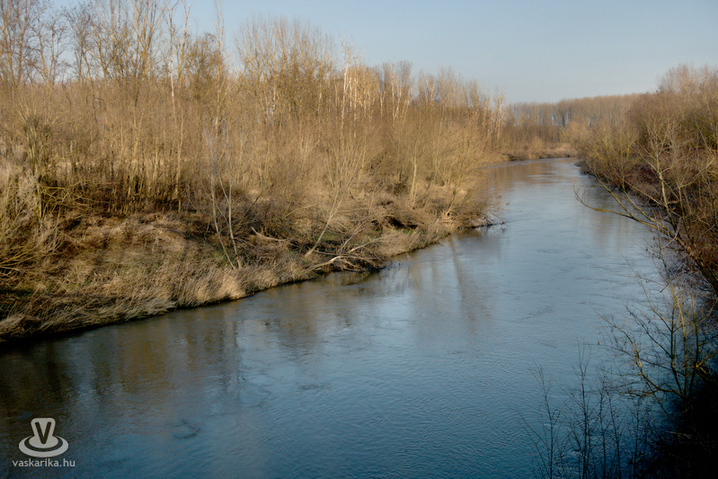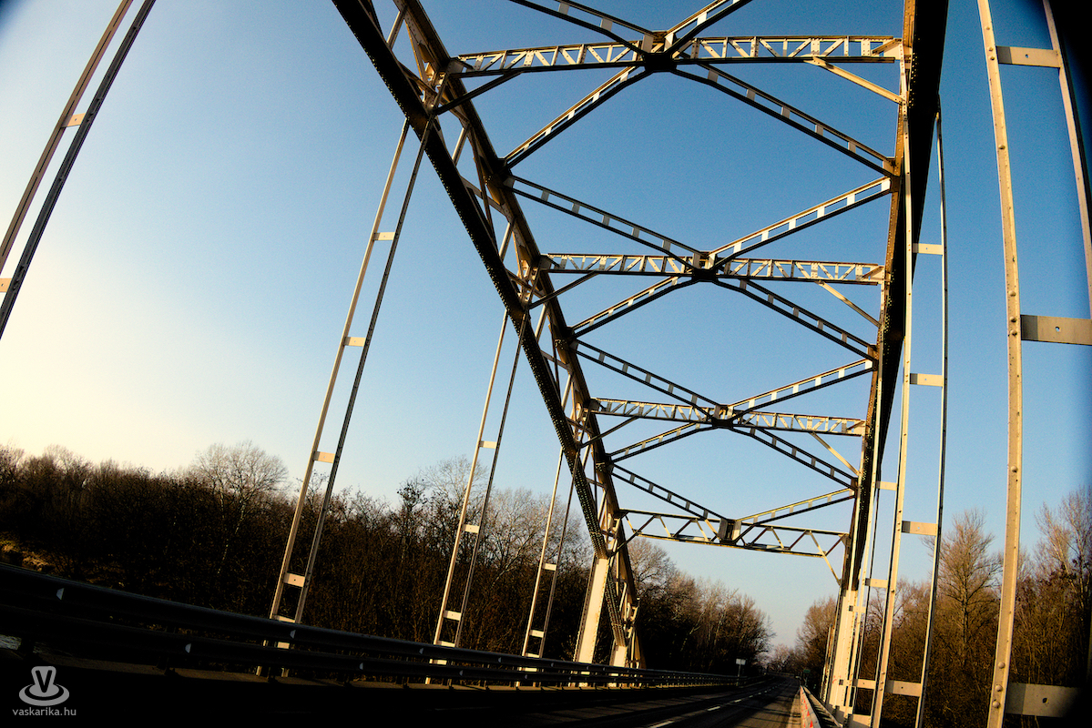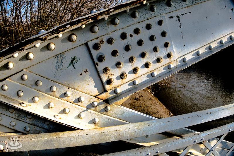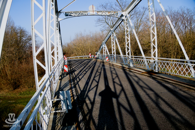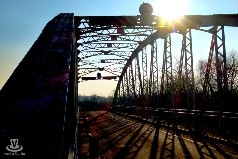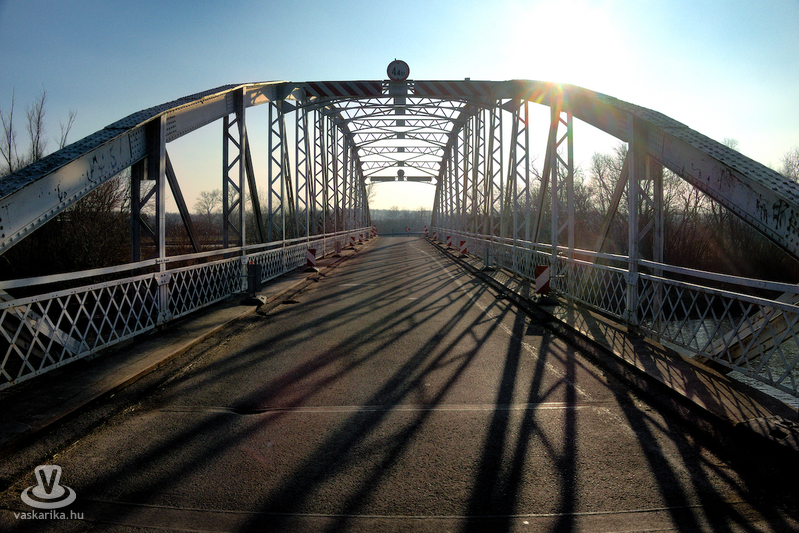 A hó nélküli hideg január napfénye rajzolgatott a fényképezőgép elé különös alakzatokat. A szegecselt vasszerkezet valódi ipartörténeti emlék, de érezzük azt is, hogy a hidak akár jelképek lehetnek. Év elején is, átérve egyik esztendőből a másikba. Ami alattunk folyik, a Rába csodálatos minden arcával, természeti szépségével.