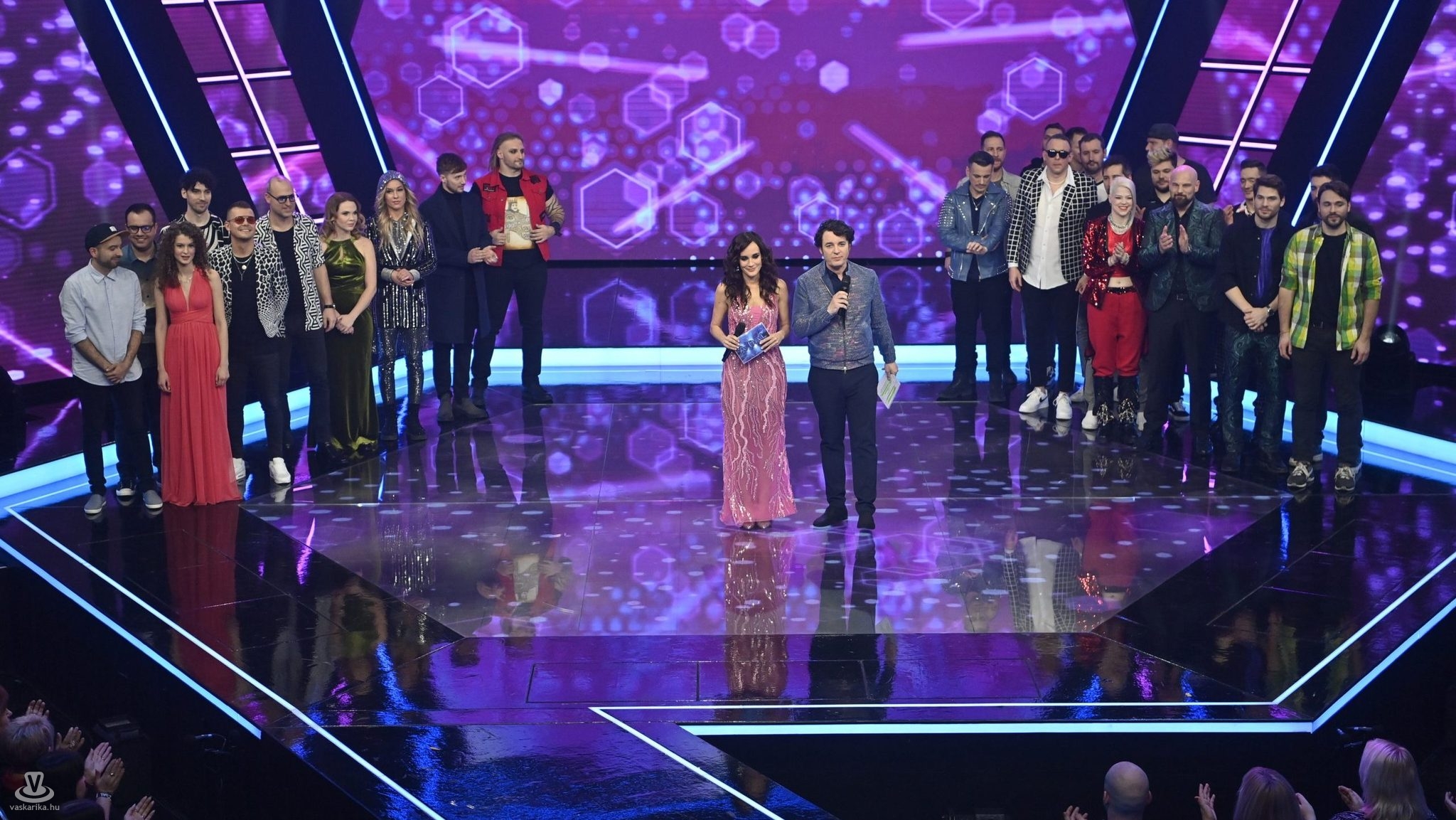 Kiemelt kép: Rókusfalvy Lili és Fodor Imre mûsorvezetõk (középen) a fellépőkkel a Dal 2024 televíziós show-mûsor első válogatóján a Médiaszolgáltatás-támogató és Vagyonkezelõ Alap (MTVA) óbudai stúdiójában 2024. február 10-én (Fotó: MTI/Balogh Zoltán)