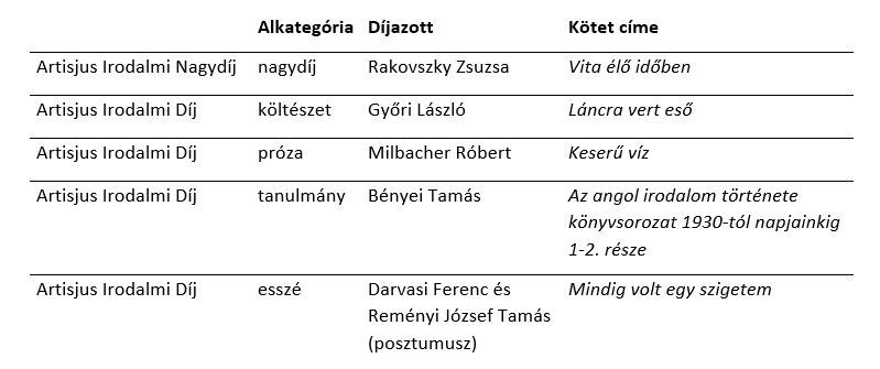 A Vita élő időben című verseskötetéért, valamint teljes életművéért Rakovszky Zsuzsa kapja idén az Artisjus Irodalmi Nagydíjat. A fődíjas mellett Győri László, Milbacher Róbert, Bényei Tamás, Darvasi Ferenc és Reményi József Tamás (posztumusz) részesül elismerésben, négy különböző kategóriában. Az Artisjus-díjat alapítása óta eddig 89 költő és író vehette át.