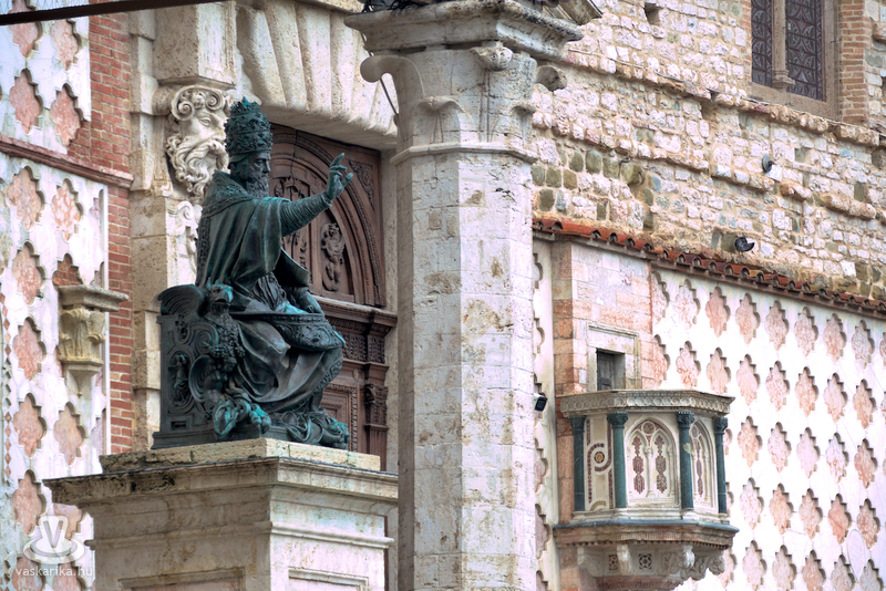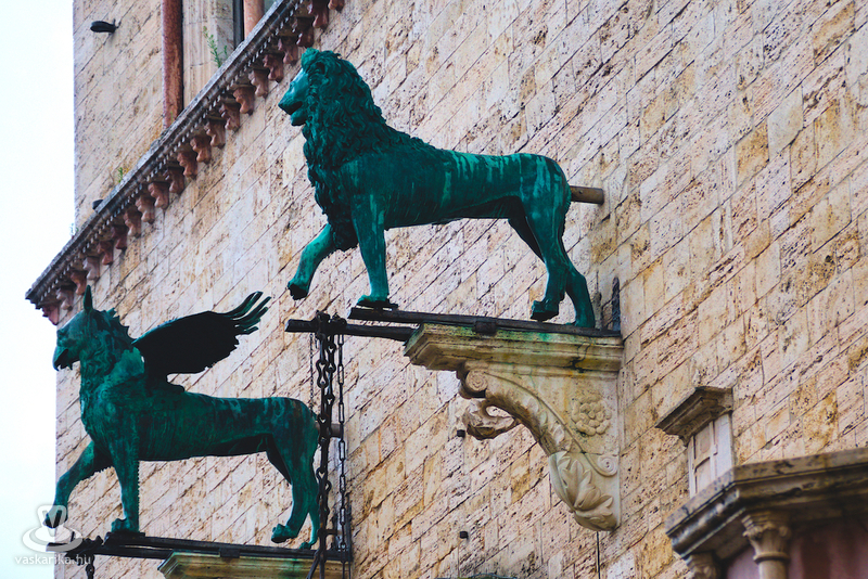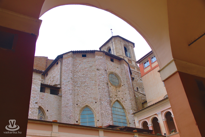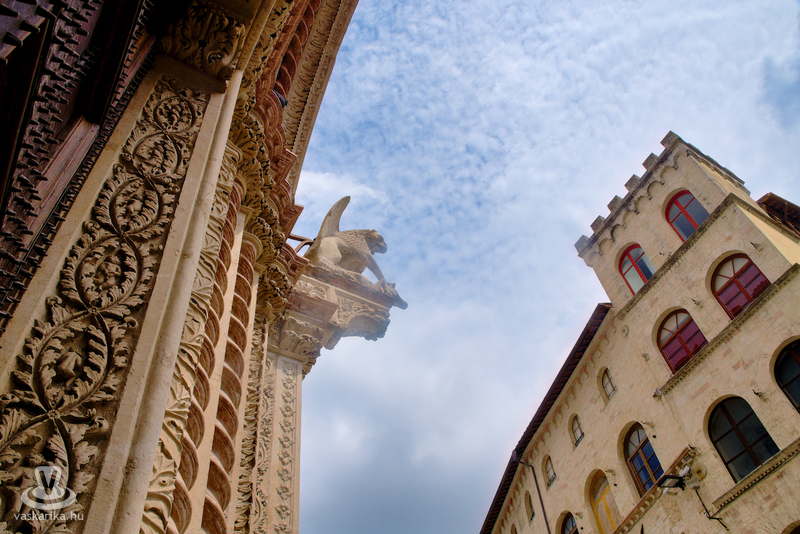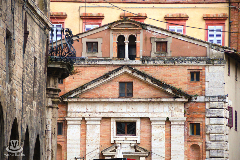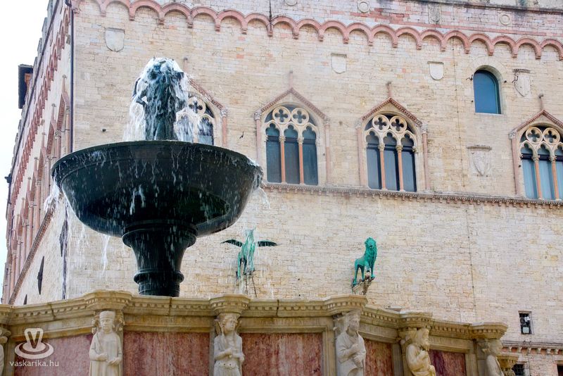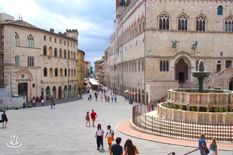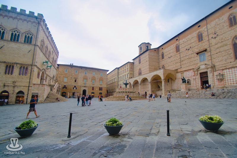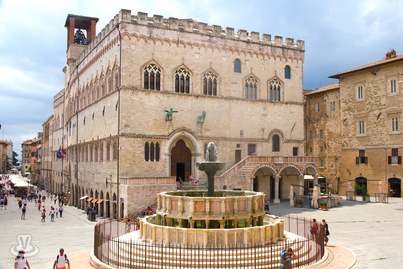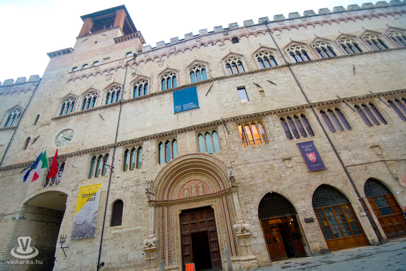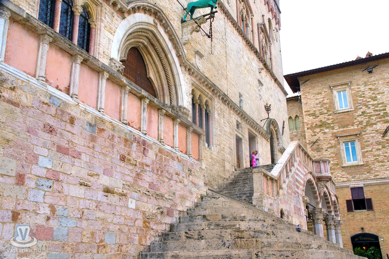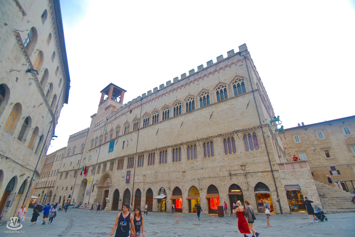 A tér egyik oldalán a Palazzo Priori, a Városi Tanács gótikus épülete. Középkori tanácsterme impozáns látvány.