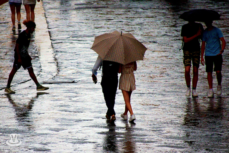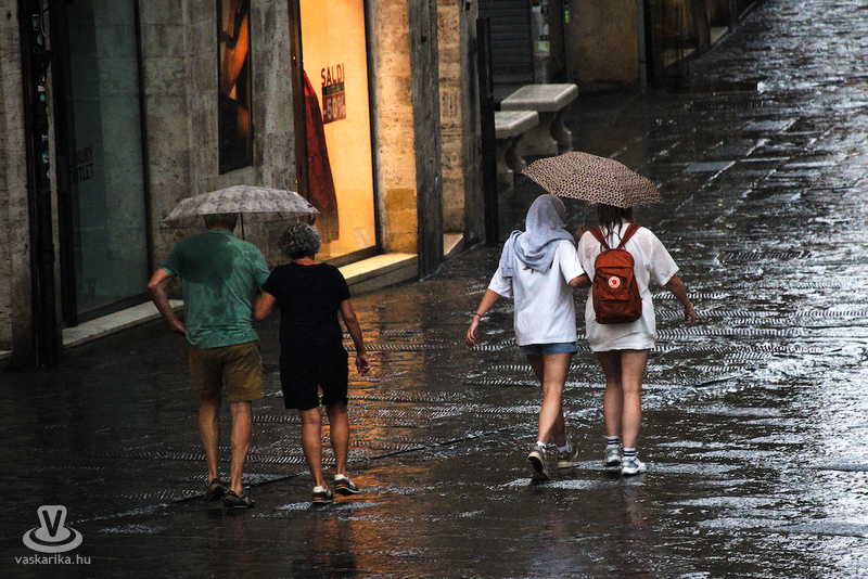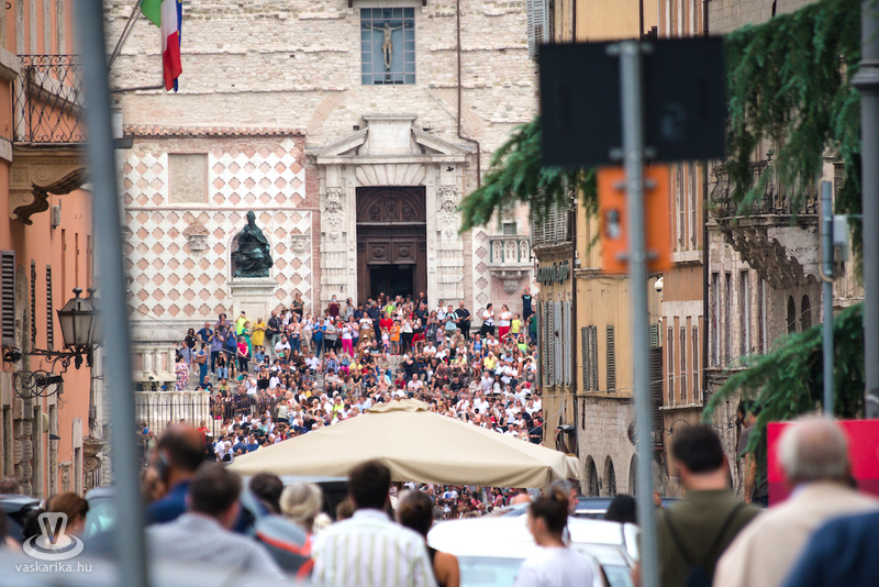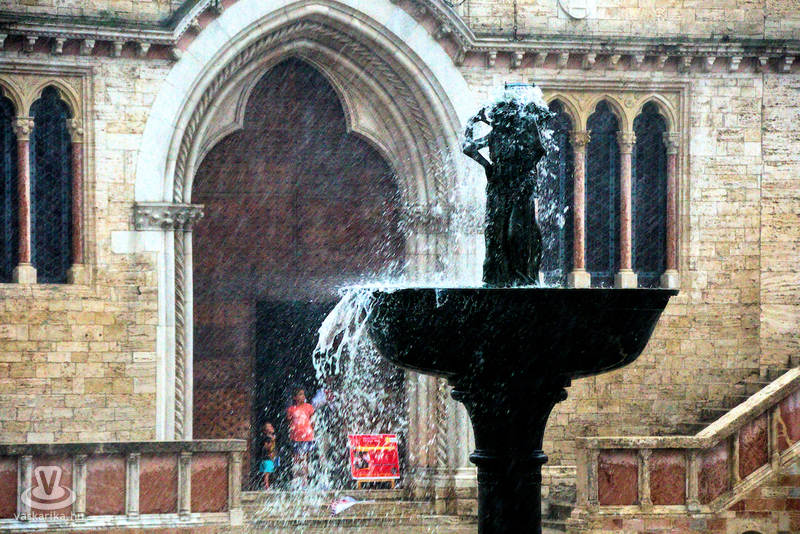 Csodás látvány az eső áztatta város, felette a viharfelhők maradékai, ám a következő eső nem sok időt hagyott a gyönyörködésre. A Collegio del Cambioba, a pénzváltók palotájába futottunk be előle, megcsodálva Perugino alkotásait.