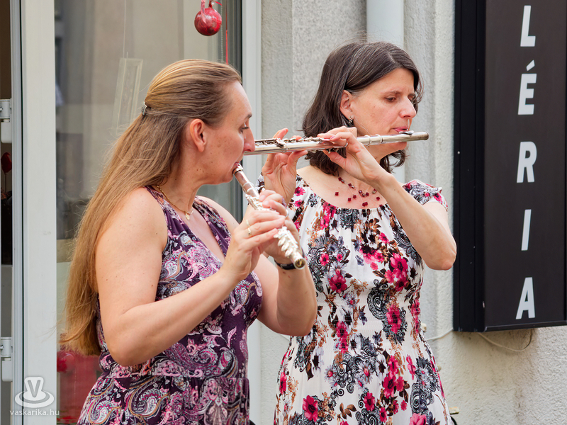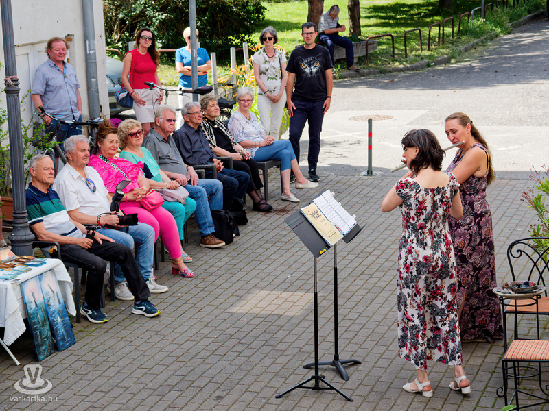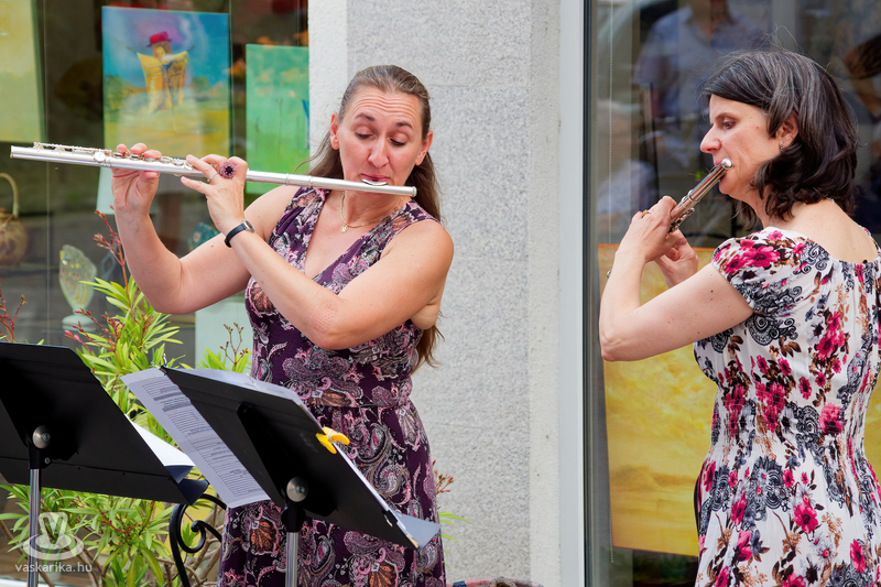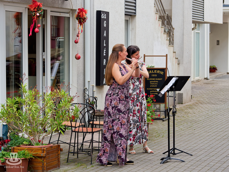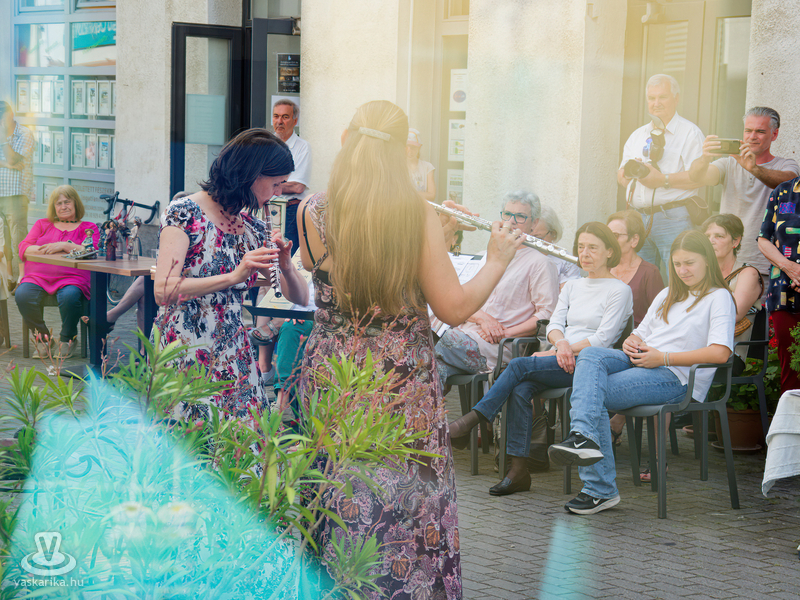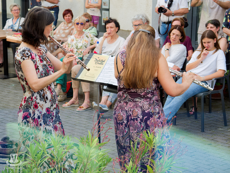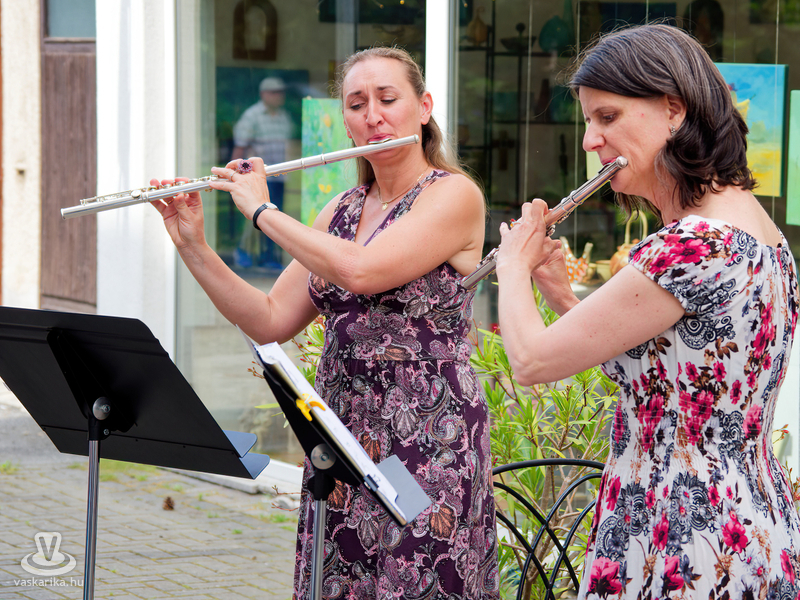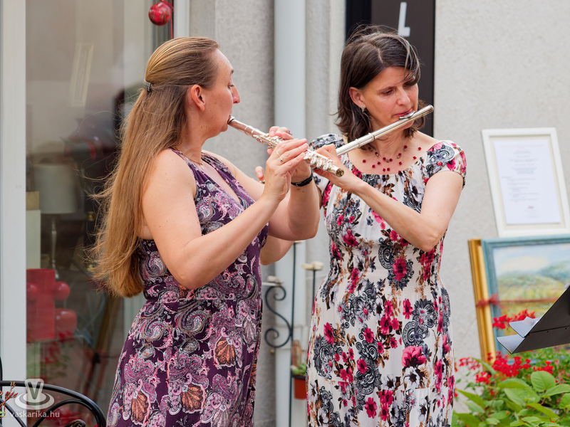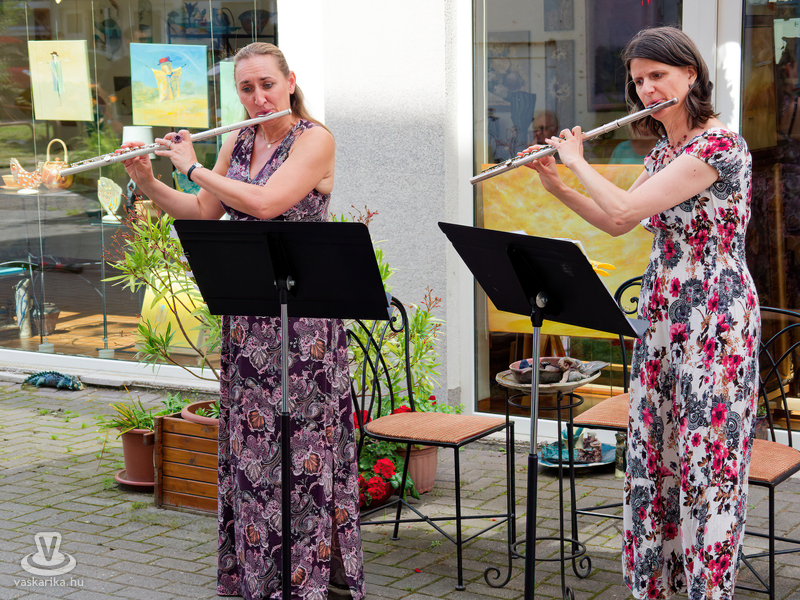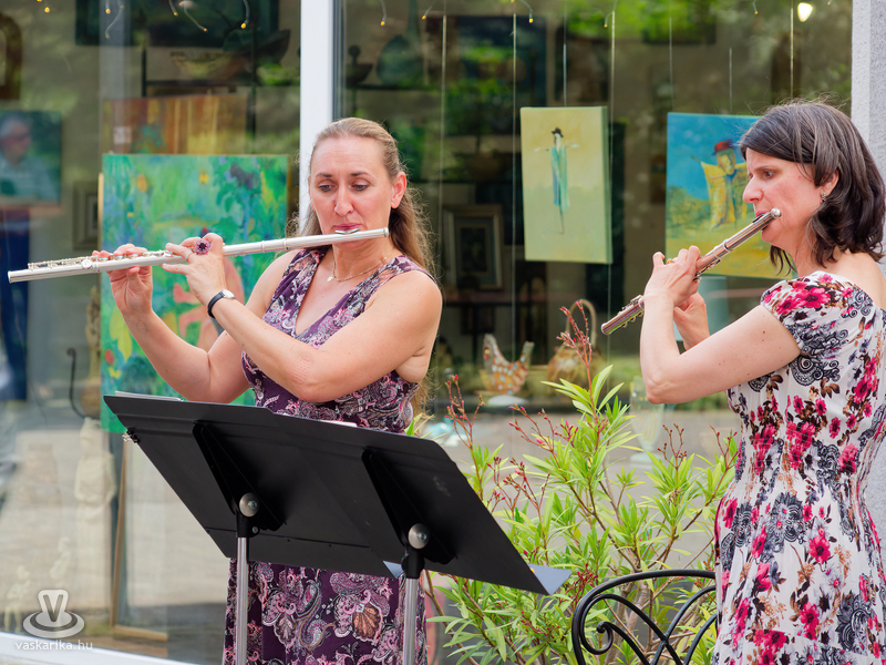 Balogh István Péter és T. Takács Tibor képei mellett az üvegékszer és a kerámia mesterfogásaiba avatták be a Mediterrán Udvarba látogatókat, és a művésztér hangulatához passzoló muzsika sem maradhatott el a nyáreleji délutánból. Kameránkkal Joó Nikoletta fuvolaművész és Mátyás Gyöngyi fuvoladuójának minikoncertjét élvezhette a művészetpártoló közönség.