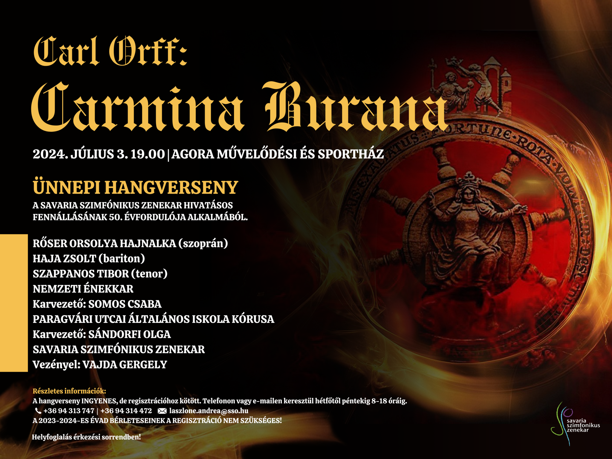 Ünnepi hangversennyel búcsúzik jubileumi évadától a Savaria Szimfonikus Zenekar! Carl Orff Carmina Burana című kantátáját a zenekar vezetőkarmestere, Vajda Gergely vezényli. A hangverseny ingyenes, de regisztrációhoz kötött! A 2023-2024-es évad bérleteseinek regisztráció nem szükséges!