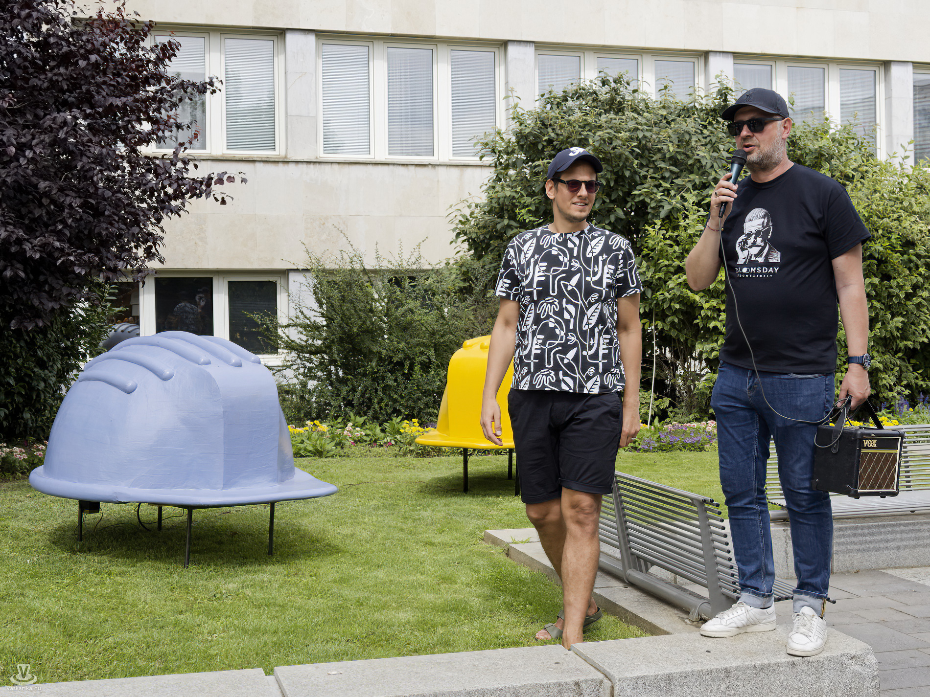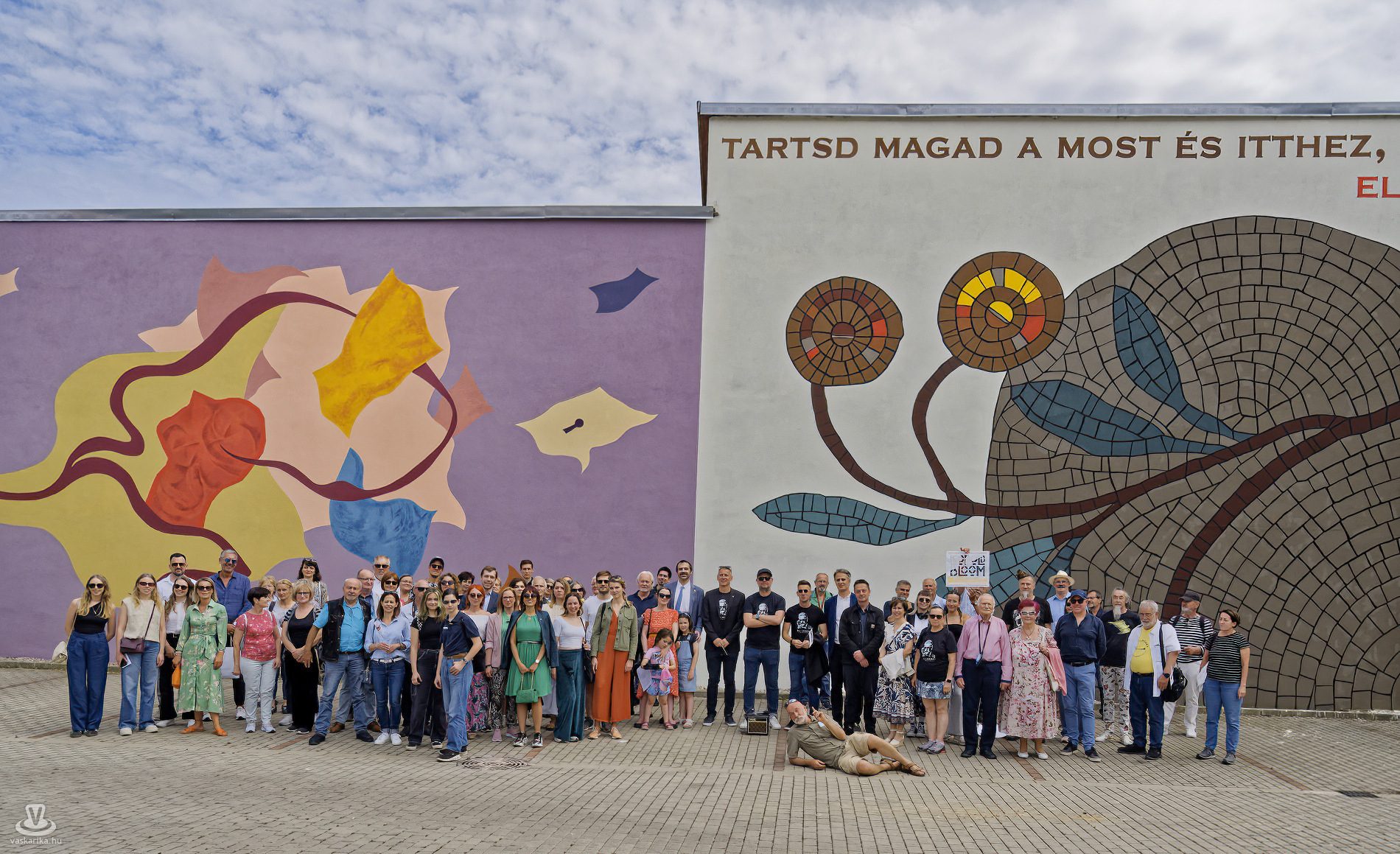 A falfestményektől egy másik érdekes kültéri alkotáshoz vezetett utunk: Horváth Csaba Árpád és Sipos Eszter: Vendégmunkások című public art művét mutatták be a Zeneiskola előtti téren.