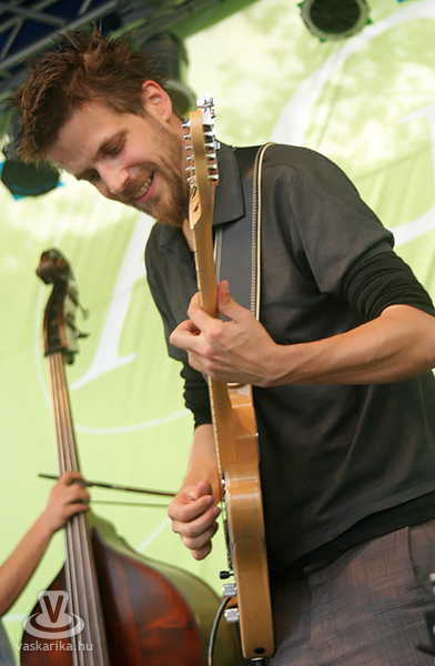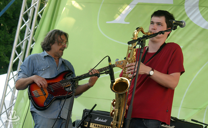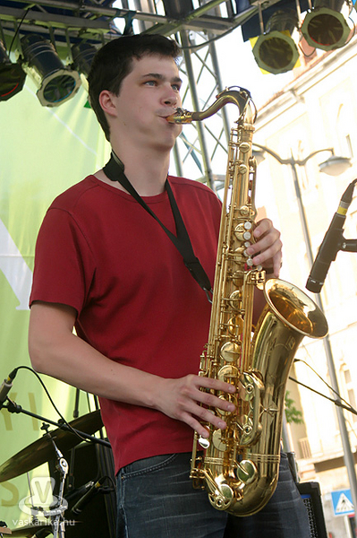 Részünkről sem kellett nagy önmeggyőzés ahhoz, hogy a délután háromra szinte fullasztóvá váló hőségben a Lazáry Quartet vs. argentin-német kisdöntő összevetésben - egy hűs szobában - mi mellett döntsünk: nem a zenét, hanem a tv-t választottuk, amit később meg is bántuk. Az pedig, hogy a kora esti - 7 óra körüli - érkezésünkkor is még csak gyülekezőben voltak az érdeklődők, csak igazolta döntésünk helyességét. Még ekkor is érezhető volt a pár órával azelőtti hőhatás, pedig ez a térkő azért nem nyeli annyira a meleget, mintha egy sima bitumen burkolatról lenne szó. Kimondottan nyáresti hangulatú koncerttel érkezett a fesztivál második zenekara, a Szabó Balázs Band. A Suhancos feloszlása után, tavaly "szerzett" maga mellé hangszereseket a névadó, és a vélhetően azóta elkészült lemezüket mutatták be. Ami egy év alatt azért is szép eredmény, mert amit és ahogy előadtak, az egy minden mutatójában összerakott és profi műsor volt. A szó legszorosabb értelmében vett világzenei pályára álltak be, hisz talán nem is tudnánk olyan földrészt említeni, ahonnan ne köszöntek volna vissza dalaikkal. Mivel az együttes még aránylag fiatal, tehát annyira nem ismerhetik egymást, betudjuk ennek azt az egyetlen szembeötlő hiányosságukat, amely igazából kettő. Az egyik a teljes stíluskavalkád - és nem az a baj, hogy sokszínű, hanem az, hogy olyan az egész, mintha négy zenekar váltogatná egymást. A másik pedig - ami idővel szintén gyógyulni fog náluk -, a slágeresség milyensége. Teljesen világos az indíttatás - talán az Ocho Macho-hoz tudnánk hasonlítani -, tehát közérthető, igényes élőzenélésnek hívhatnánk. Amíg azonban macsóék ontják a könnyen megjegyezhető slágereket, addig itt ezek még hiányoznak. A többi rendben. Kitűnő hangszeresek, pontos ritmusszekció, laza, kicsit funkos, rockos-jazzes hangzás, csárdás fílinggel, karibi ritmusokkal, francia poppal, illetve mindennel egybefolyatva. Teljesen passzoltak az időponthoz és a helyhez, illetve a főzenekarként utánuk fellépő Belmondóhoz.