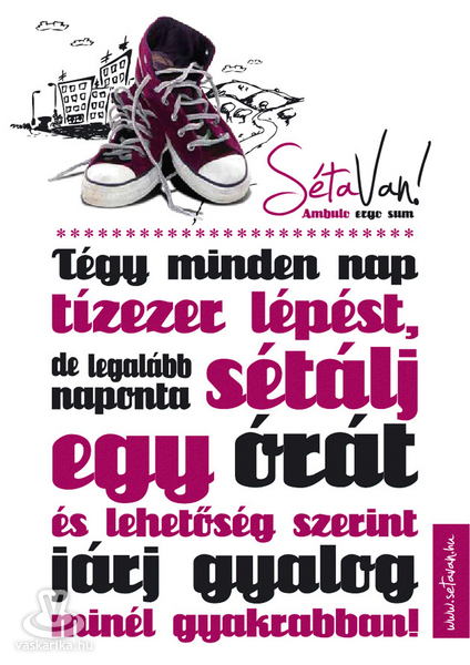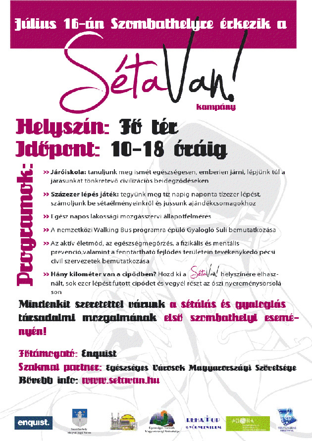 Egészséges járást tanító Járóiskola, hiánypótló prevenciós mozgásszervi szűrés, országos gyalogló mozgalom, Százezer lépés játék, akciók és városok versenye - ezek mind a Séta van! országos kampányának programelemei. A Hány kilométer van a cipődben? című akció keretében a szervezők elhasznált, széttaposott cipőket várnak a kampány-helyszínekre. A „sok ezer kilométert futott" cipők az őszi budapesti kampányzáró eseményen egy köztéri művészeti akció főszereplői lesznek, tulajdonosaik pedig sorsolásos nyereményjátékban vehetnek részt. A szombathelyi esemény házigazdája Végh György, az Egészséges Városokért magyarországi Szövetsége szombathelyi társkoordinátora.