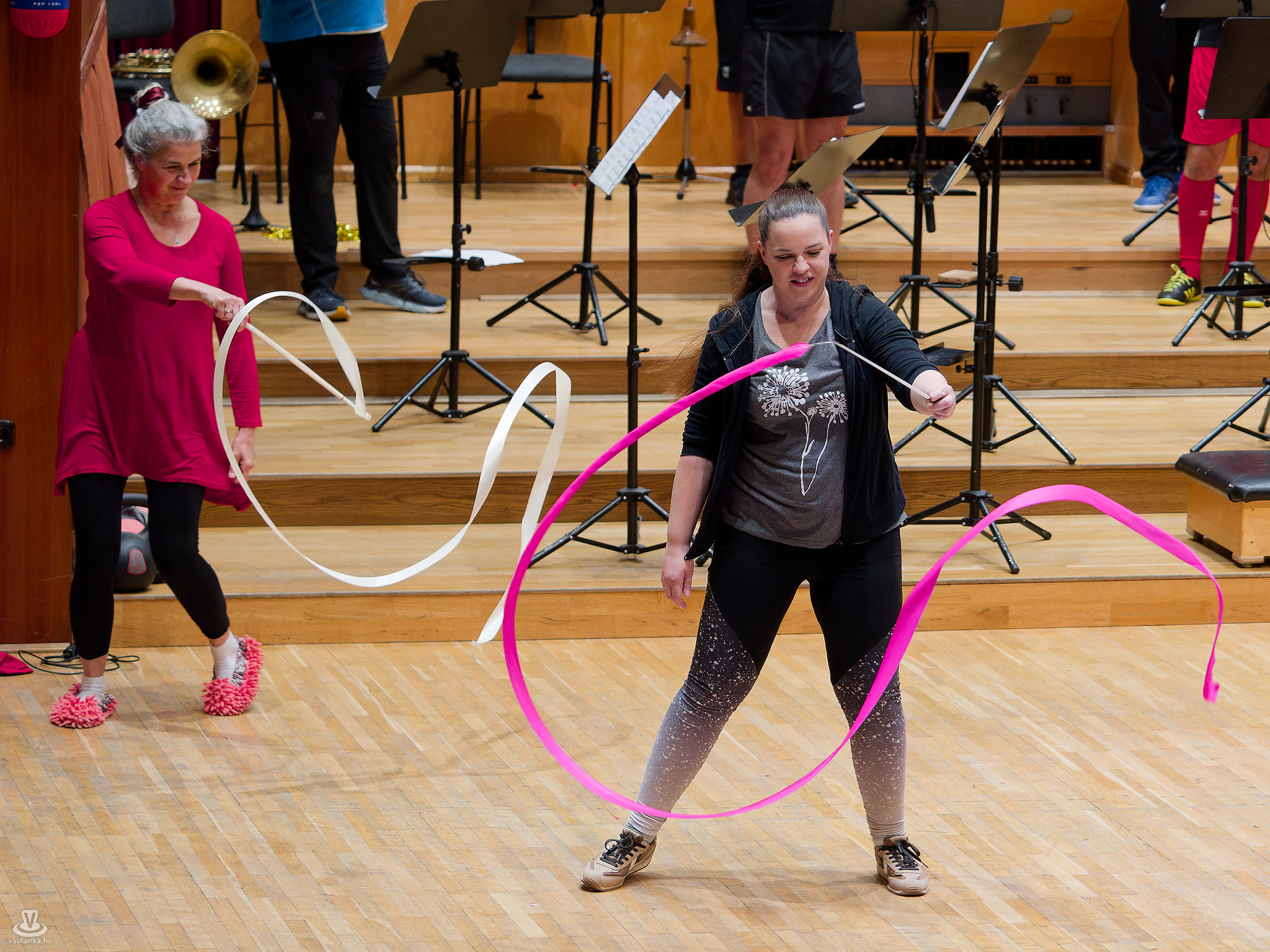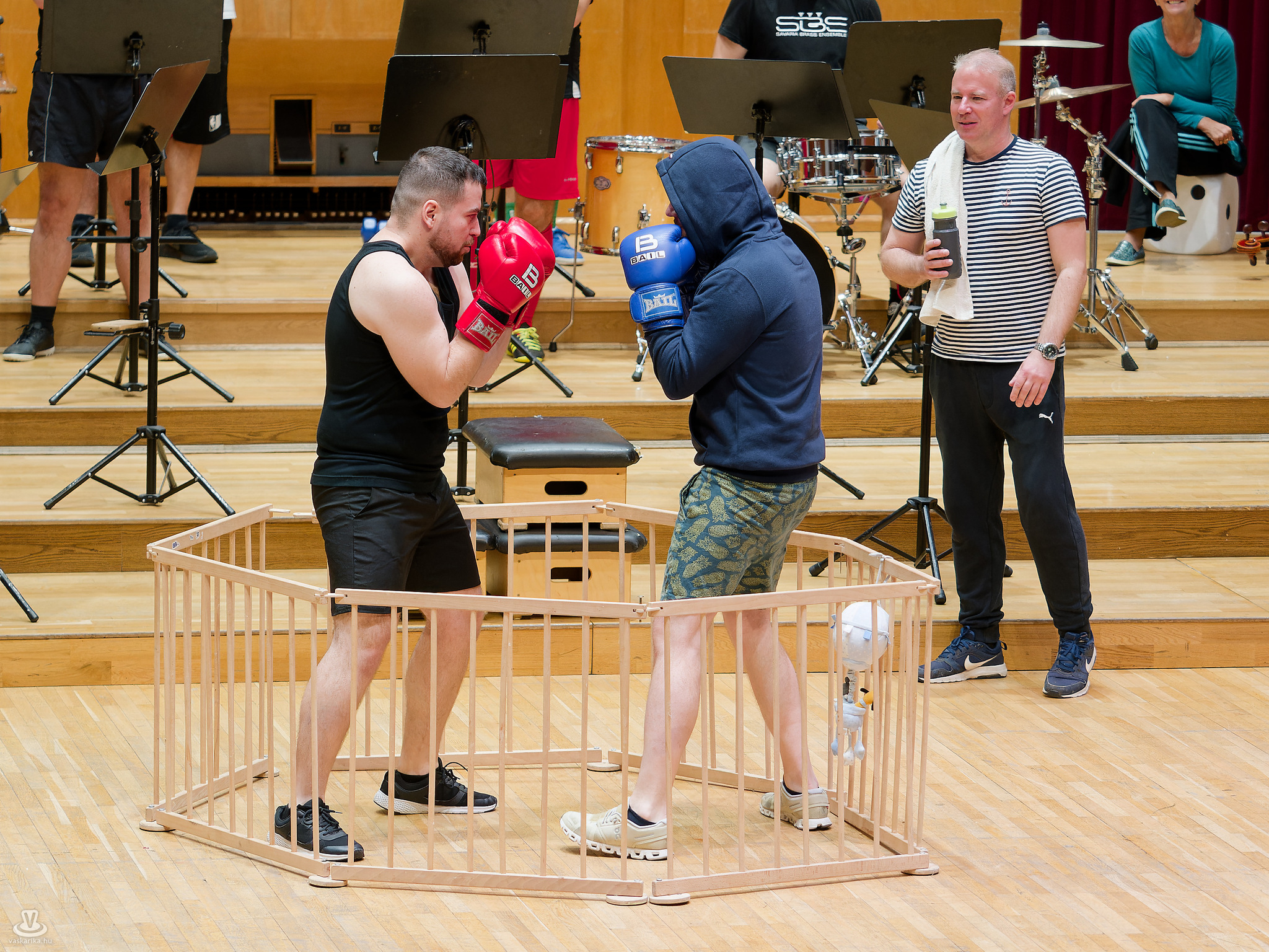 A járókakeretekből összerakott bokszringben rendezett ökölvív(ód)ás sem maradt el tőle, ami a ragtime zenére volt igazán vicces, de az Örömódára hullahoppozás és a szalaggyakorlatok "kecsessége" is szilveszteri show után kiáltott! A vívók - fegyver híján - a vonósoktól "elszervált" vonókkal vívtak, így a zenei kísérthez nem maradt más, mint a művészek ujja - jött is a vívás aláfestéseként a Pizzacato Polka. Volt még tollaslabda, amiben élőhálót alkottak a vonósok, felettük pedig a Bartók Terem legmagasabb pontjait is megjárta a tollaslabda a gyerekek legnagyobb örömére. A vége nem lehetett más, mint a foci, amiben a csapatok a kihagyhatatlant is képesek voltak kihagyni, végül egy "úszófejessel" - ha van felhőfejes, akkor ez az ellentettje - nyertek a Rezesek.