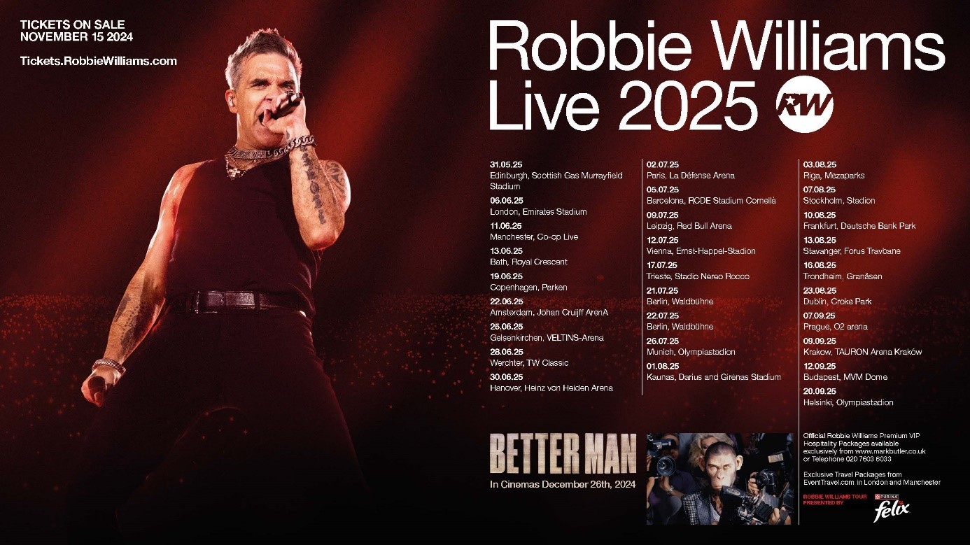 A Robbie Williams Live 2025 turné május 31-én Edinburgh-ban indul. A koncertkörút ezt követően Londonba, Manchesterbe és Bathba is elér, majd Európa következik, ahol Robbie többek között Írországban, Franciaországban, Németországban, Spanyolországban, Olaszországban és Svédországban is fellép. Tavalyi nagysikerű, pillanatok alatt teltházas koncertje után pedig Budapestre is visszatér. A Robbie Williams Live 2025 turné szponzora a FELIX a Purinától, amely a legkelendőbb macskaeledel Európában.