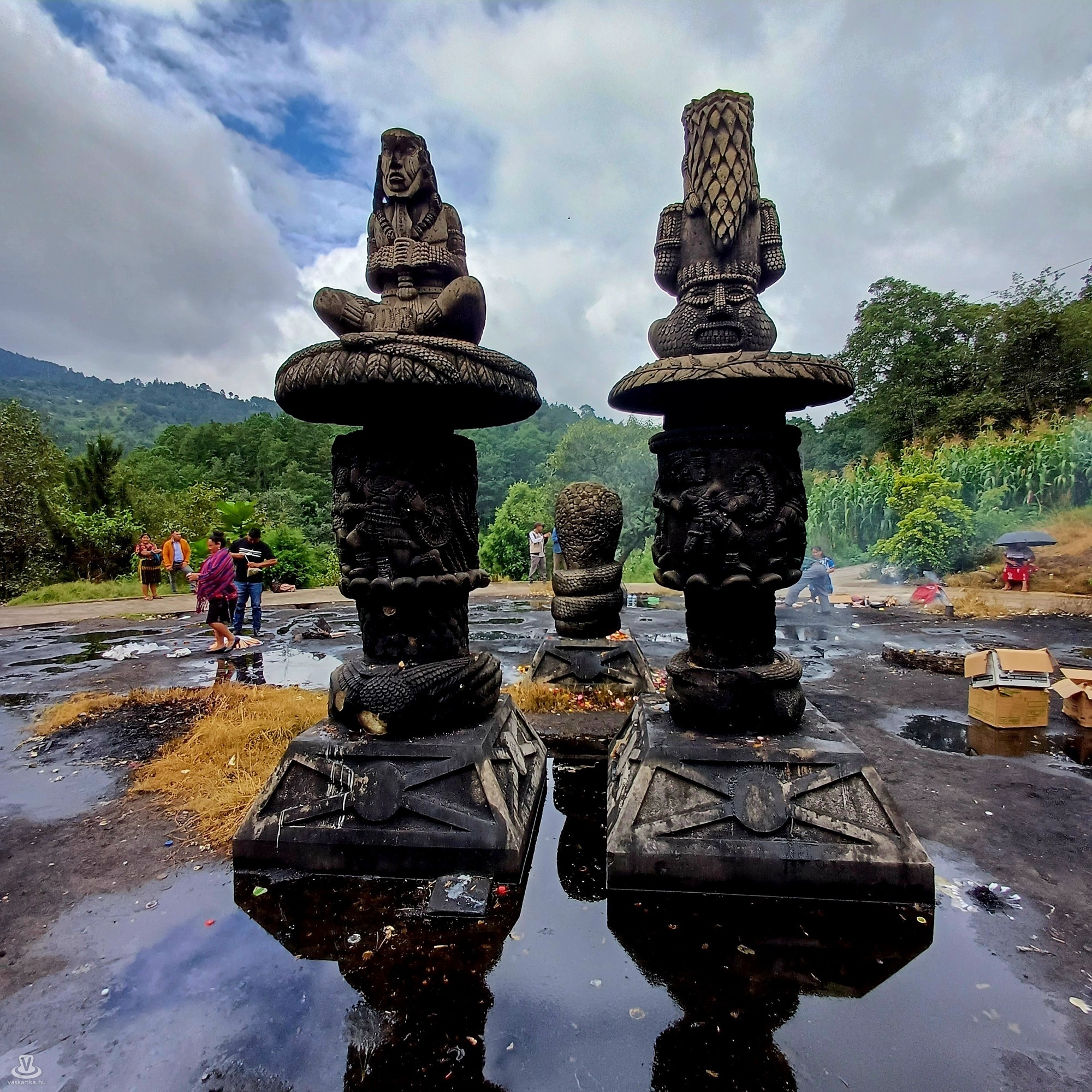 A temető dombjáról lesétálva a négyméteresre nőtt kukoricatáblák mellett van az áldozati helyek egyike, Oxlajuj Baktun. A kör alakú téren a négy fő égtájnak megfelelően, sztéléket -faragott kőszobrokat- helyeztek el, de ezeken kívül még vannak ott méretes szobrok, amelyek mind-mind a maja szertartásokhoz tartoznak. Mindegyiknek, és mindennek jelentősége van. Ottjártunkkor több áldozati szertartás is zajlott egyidőben. A tér egyik szélén fiatal maja nő imádkozott hangosan, miközben egy bottal a tüzet, az égő parazsat kavargatta. Egy népviseletbe öltözött idősebb házaspár a szertartáshoz való kellékeket művészi pontossággal helyezte fel az áldozati oltárra: színes, türkizékre és sárgára színezett cukrot, amelyből két kört rajzoltak fel. A kör közepére egy pontot tettek, amely azt az ügyet jelentette, vagy azt a személyt jelképezte, akiért az ima szólt. Egy szertartás hossza attól függ, mennyire fontos a fohász, amiért folyik. Betegség, család, üzlet, szerelem - mindent meg lehet oldani. A kérelmet a füst segítségével lehet eljuttatni az istenekhez, ezért az illatnak kellemesnek kell lennie, ezért kell a cukor. Ezek a szertartások költségesek, (150 dollár), egy guatemalai család egyhavi keresetét jelentik.