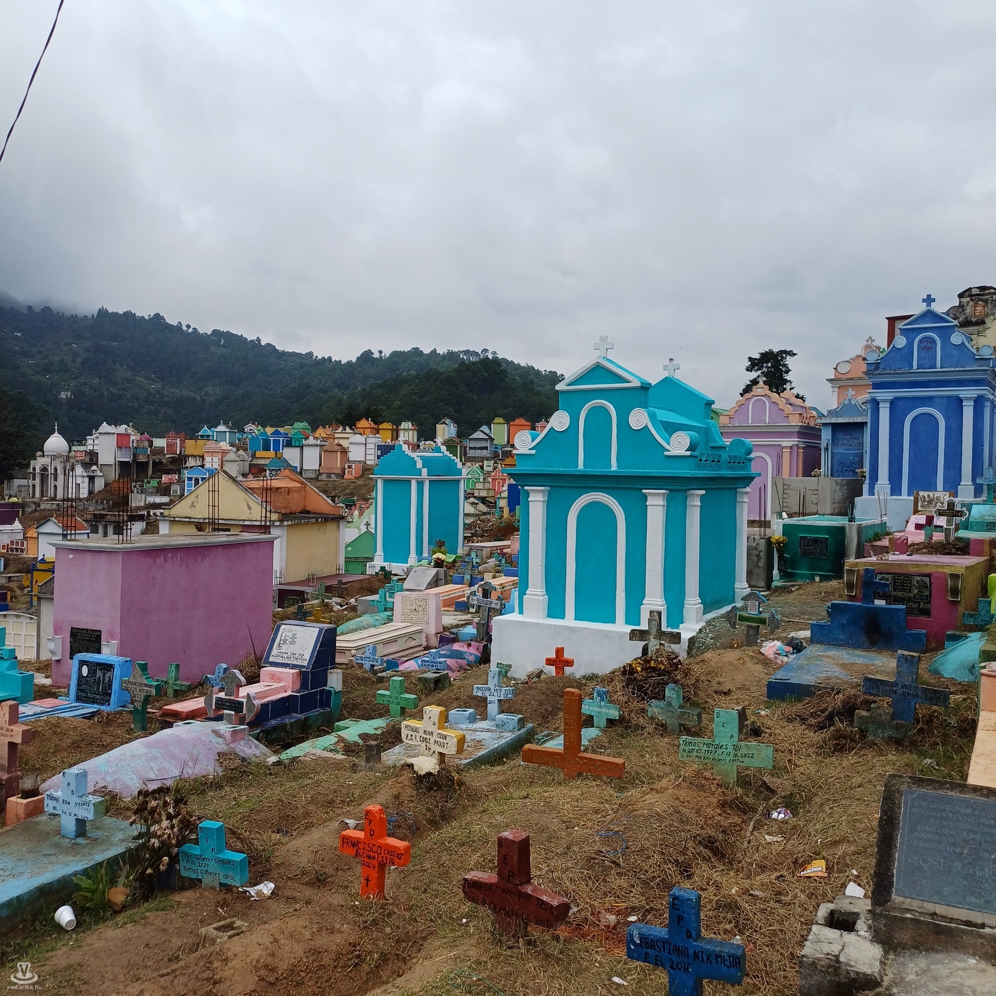 Chichi (a helybeliek így nevezik a várost) belvárosát elhagyva idegenvezetőnkkel a világ egyik legszínesebb temetőjébe látogattunk el. Egy guatemalai temető nem komor és sötét, oda nem kell félelemmel belépni. Türkizkék, sárga, zöld, rózsaszín sírok között lehet bolyongani, néhányuk közülük hatalmas mauzóleum. Láttunk ott kisméretű Taj Mahalt, meg egyiptomi piramist is - mint síremléket. Minden évben, halottak napja előtt, a családok újra lefestik a sírokat. Október közepe lévén mi is láttunk vidám festőcsapatot, amint újra mázolták a kissé kopott türkizkék épületet. Mert a színeknek is van jelentése, azok jelzik a halott korát, nemét, élete során űzött hivatását. A maják nagyon hisznek abban, hogy ha nem tisztelik halottjaikat, akkor a lélek az élet és a halál csapdájába kerülve soha nem nyugszik meg, hanem csak bolyong. És ezt senki nem akarja.