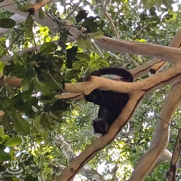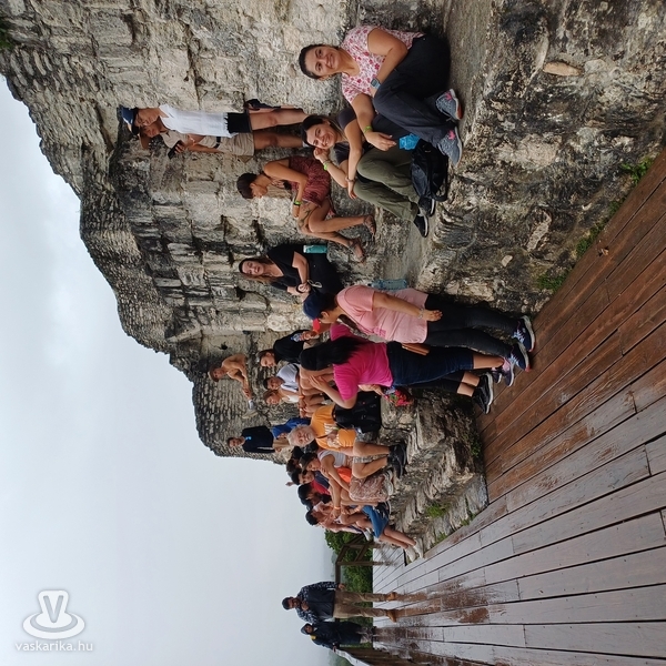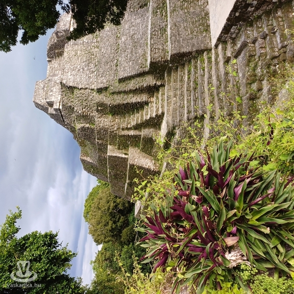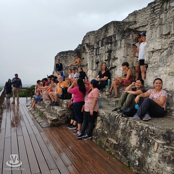 Harmadik Petén-i napunkon megint naplementés programot választottunk, így délelőtt csavaroghattunk egyet a szigeten, sőt, átmentünk a keskeny úton, amely a szigetet a szárazfölddel összekötötte, és a San Benito városrészen levő bevásárlóközpontban tudtunk ebédelni, vásárolgatni. Én még a hotel medencéjében is megmártóztam, míg nejem az üzleteket járta. Délben szedett össze minket a kisbusz, ezúttal európai kirándulókkal: németek, spanyolok, franciák voltak útitársaink a Yaxhá felé vezető úton. A látnivaló a Yaxhá- Nakúm- Naranjo Biosfera Reservatum területén található. Ide is szűk kétórás zötykölődés után értünk, majd a parkolóból a Yaxhá lagúna partjára irányítottak minket. Elhalt, gnómszerű hatalmas fák meredeztek csupasz ágaikkal ijesztően a szelíd tóból, de a madár- és rovarvilág - nem törődve a krokodilokkal - élte-nyüzsögte mindennapjait. A romok előtt még a látogatóközpontba is benéztünk, ahol a preklasszikus, azaz 600 előtt, pontosan i. sz. 250 és 600 között fénykorát élt maya város történetét, főbb korszakait uralkodóival, és építészeti emlékeit mutatták be. Kevesebbet kellett mennünk, mint Tikalban, a Calzada Lincoln ösvényen a keleti parton levő lagúnától a Complejo Astronomico Mayor, a Nagy Csillagvizsgáló, és az Acropolis Norte, az Északi Akropolisz fele. Szemet gyönyörködtető, lelket nyugtató ligeteken haladtunk át. A magasban pálmák és lombhullató fák, tele immár nagyobbacska bőgőmajmokkal, színes, pozsgáslevelű bokrok, szépen ápolt gyep: ezen baktattunk a feltárt, rekonstruált, és a még mohás, megtisztításra váró építmények között. A csillagvizsgálóhoz falépcsőn lehetett felmenni, amely nem volt kimerítő, majd a legimpozánsabbat, a tér három oldalán három, a Nap, a Hold, és a csillagok piramisai által közrefogott Északi Akropoliszt jártuk be. A legmagasabb 22 m magas volt, a többi sem sokkal kisebb. Nem voltak kiépített, kapaszkodós lépcsők, az 1500 éves omladozó-töredezett köveken kapathatott fel az, akinek volt bátorsága és nem volt tériszonya. Nejem is felment, én inkább lentről filmeztem. Közben egy labdajátékpályát is megtekintettünk. A maja sportban nem kézzel, lábbal is csak ritkán, inkább vállal passzolgatták a labdát az oldalfalakon található, kosárlabdapalánk magasságú gyűrűbe. Nem babra ment a játék: a vesztes csapat kapitányának bizony fejét vették a meccs után. Már a bőgőmajmok is megszólaltak mély, öblös hörgésükkel, amelyet még régebben jaguárüvöltésnek véltünk.