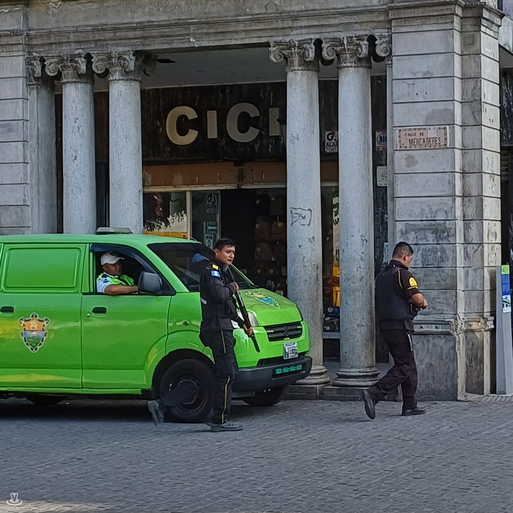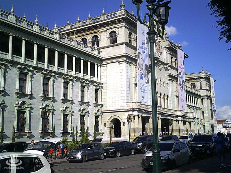 Előtte nap még megnéztük Guatemalaváros látnivalókban amúgy nem bővelkedő nevezetességeit, melyet, eredeti tervünkkel szemben nem buszokkal és gyalog, hanem egy utazási iroda által ajánlott városnéző programmal bonyolítottunk le. Nagyon veszélyes város ez, sötétedés után nemhogy nem szabad, hanem tilos kimenni, de a kerületek (itt zónákra van osztva a település) zömében nappal sem ajánlott. Brazil-maja idegenvezetőnkkel csak mi ketten vettünk részt a túrán. A Las Americas sugárútról, ahol a közép-, és dél-amerikai „testvérországok" tiszteletére emelt emlékművek, szobrok láthatóak, és köztük volt a világhíres guatemalai Nobel- díjas költő, Miguel Asturias bronzszobra is, az Avenida Reforma-ra hajtottunk. A franciák által ihletett széles sugárút márvánnyal díszített palotái tetszetősen mutatták magukat. Sajnos nem álltunk meg, csak futólag láttuk a vasból emelt Torre Reformadort (1930, 72 m.), a párizsi Eiffel- torony itteni utánzatát. A Jurita- templomnál viszont pár percre igen. A vegyes stílusban, barokk, román és bizánciban épült kissé giccses istenháza egy fogadalmi templom, a Santa Maria vulkán kitörésétől félve húzták fel. Majd a modern városközpont felé, a Centro Civico felé mentünk, ahol a Városháza, a Legfelsőbb Bíróság, és egyéb hivatalok modern épületei állnak. Aztán végre megérkeztünk Guatemalaváros főterére, a Plaza Constitucion-hoz. Itt végre kiszálltunk a kocsiból. A teret két hatalmas épület uralja: az 1830-ban épített Metropolitan Catedral óriási tömbje, a tér másik oldalán pedig a még nagyobb Palacio Nacional, a mindenkori elnökök palotája. A tér harmadik látnivalója a Piac, a Mercado. Óriási területen helyezkedik el, kétszintes, és sok száz üzlet található benne. Minden, ami egy piacon megvehető, itt is megkapható. Újat azonban itt is tanultunk. Négyféle banánkínálattal szolgált valamennyi gyümölcsárus, nemcsak az általunk ismert eggyel. A pici, vöröses húsút meg is kóstoltuk. A sétálóutcán haladva az őslakosok által megszokott, de nekünk szokatlan életképpel lettünk gazdagabbak: egy gyalogsági harckocsiból két, csőre töltött géppuskával felfegyverzett katona szaladt be az egyik házba. Nocsak! Visszatérve biztonságos hotelünkbe este itt fogyasztottuk el az előre bebiztosított szendvicseinket: nem szívesen mentünk volna ki vacsorázni.