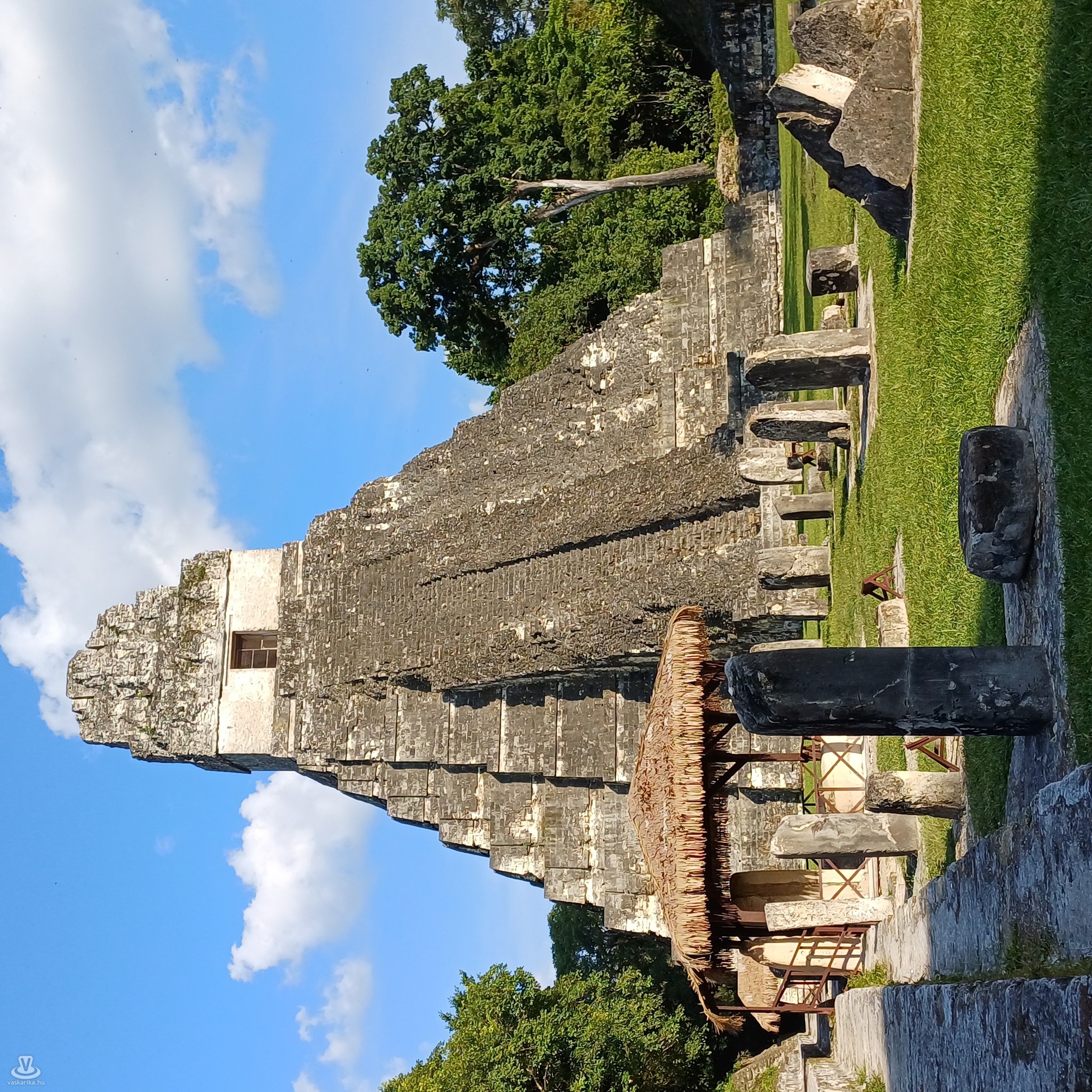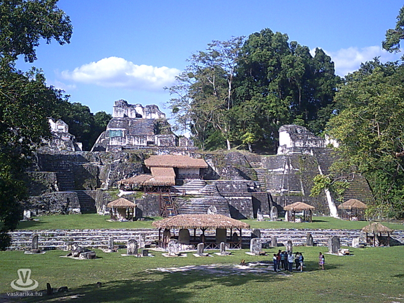 A főtéren aztán hirtelen elénk tárult a szemben álló két, meredeken, 55 fokos szögben meredő piramis. A bejárt területeken látott építmények 695 és 820 között épültek, Tikal városállam fénykorában, amikor lakosainak száma akkor óriási, 90.000 lehetett. Az I. struktúra, a 45 m magas Nagy Jaguár templom a leglátványosabb, nem megmászható, ugyanúgy, mint a II., a Maszkok temploma sem.