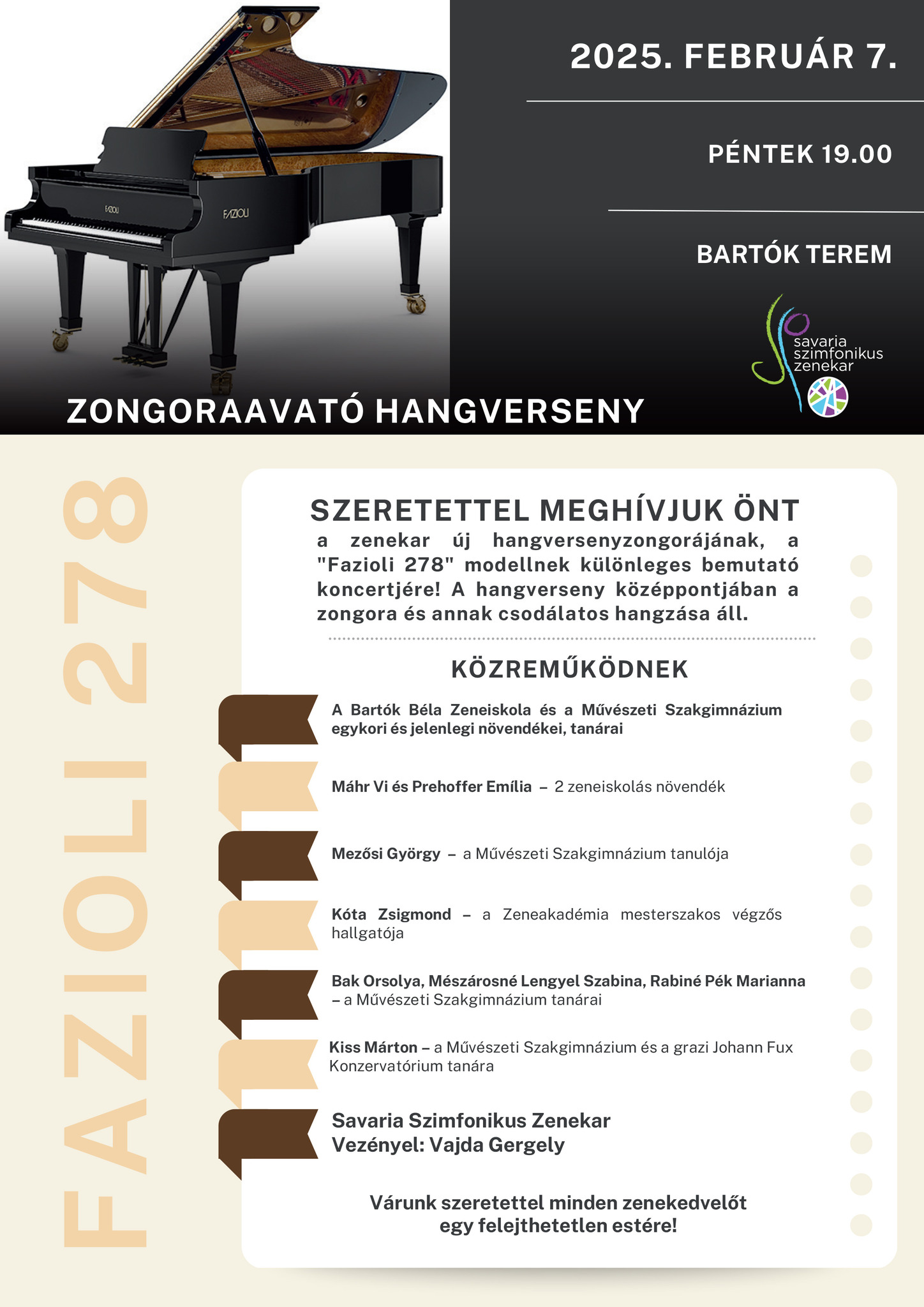Új hangszer, a zongorák Stradivárija, azaz egy új Fazioli 278-as zongora érkezik a Savaria Szimfonikus Zenekarhoz, amit egy avatóhangversennyel "vesz birtokba" a zenekar február 7-én, 19 órától.