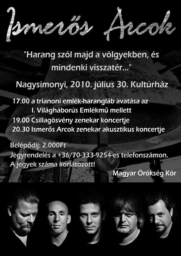 2010. július 30-án pénteken 17 órától Nagysimonyiban trianoni emlék-harangláb avató lesz, majd utána ez alkalomból Csillagösvény és Ismerős Arcok koncert.
