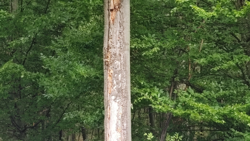 A Kéktúra útvonalán, a Káld-Hidegkúti Ökoturisztikai Központunkhoz vezető erdészeti magánút mellett az egyik holtfában lakó rovarok valószínűleg a fészküket védik az arra közlekedőktől.